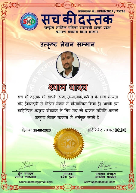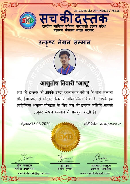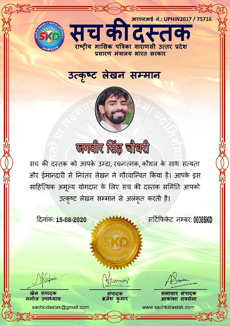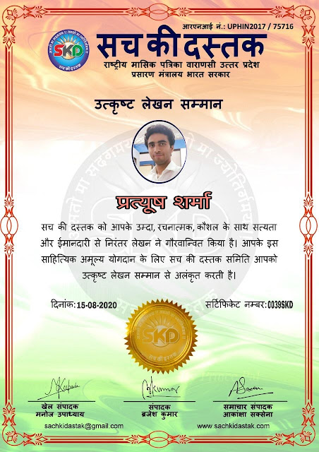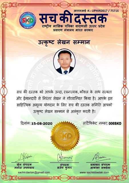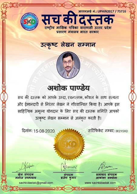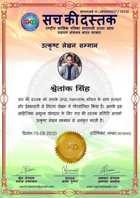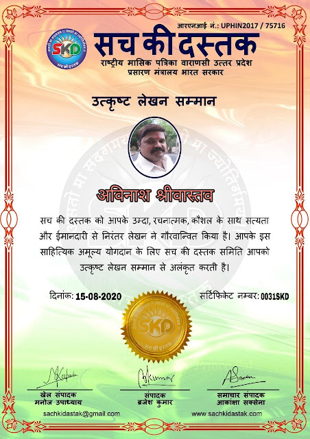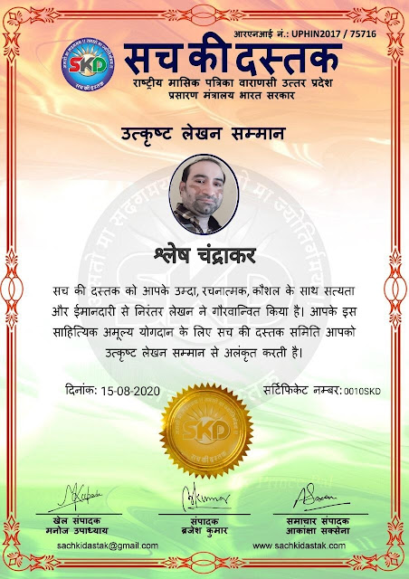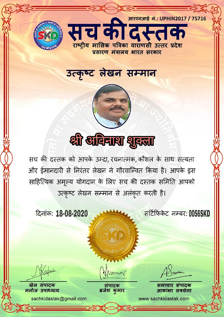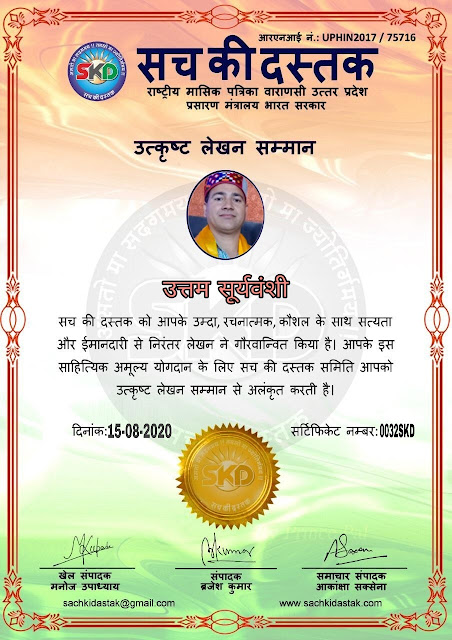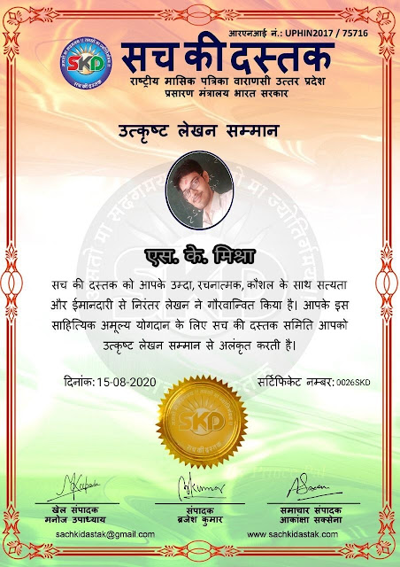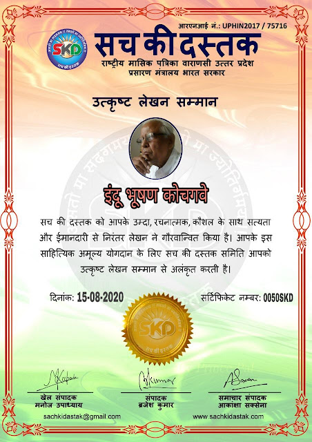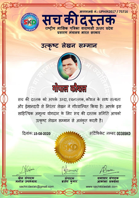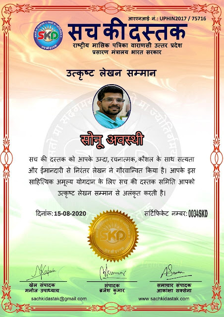 स्वतंत्रता दिवस के पावन अवसर पर सच की दस्तक द्वारा आयोजित गोष्ठी विषय – आत्मनिर्भर भारत बनायें । में सच की दस्तक के कई विद्वान लेखकों ने अपनी उपस्थिति दर्ज करवाई और इस गोष्ठी का संचालन दस्तक के प्रधान संंपादक ब्रजेश कुमार व वाराणसी के महान मनीषी श्री कृष्णकांत श्रीवास्तव जी, इंदुभूषण कोचवे, स्पोर्ट्स एडीटर मनोज उपाध्याय व न्यूज एडीटर आकांक्षा सक्सेना व कई विद्वानों के सानिध्य में आयोजित की गयी जिसमें इसके उपरांत सच की दस्तक के नियमित लेखकों को भी उत्कृष्ट लेखन सम्मान और बेस्ट राईटर अवार्ड से 45 लेखकों को सम्मानित कर,हिंदी साहित्य की सेवा का वचन लेकर कार्यक्रम का समापन हुआ।