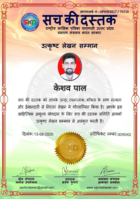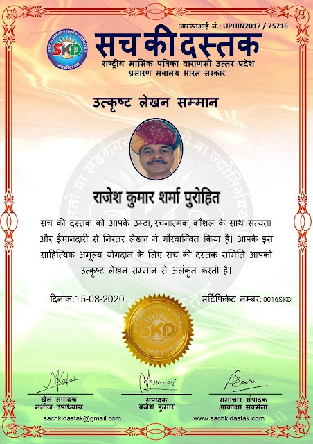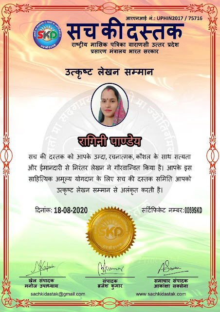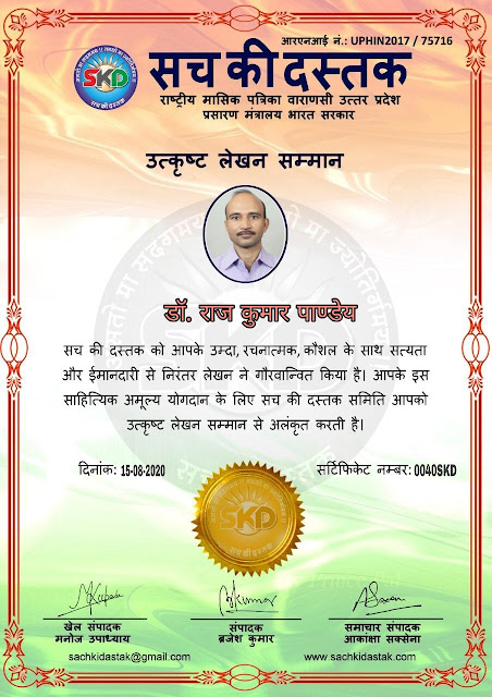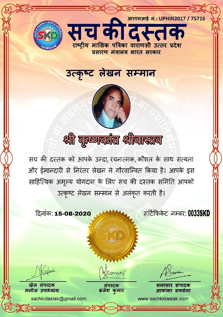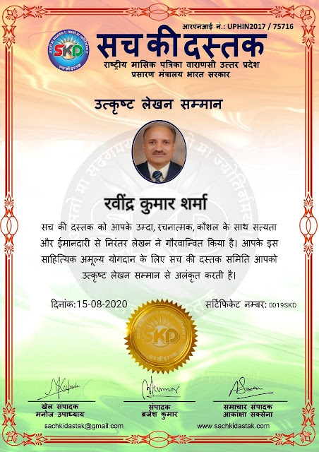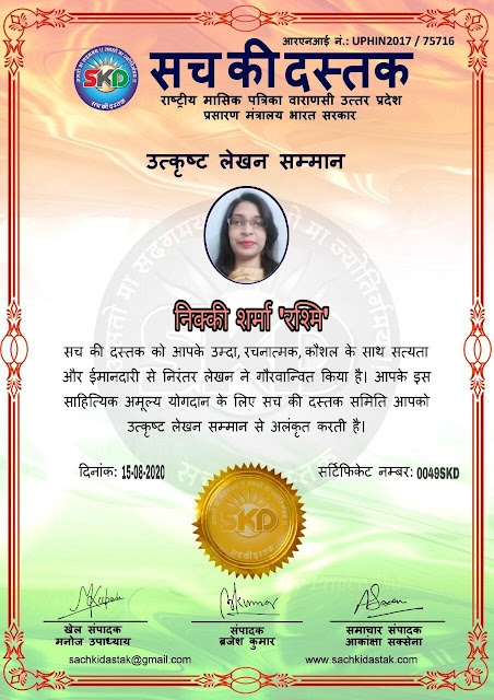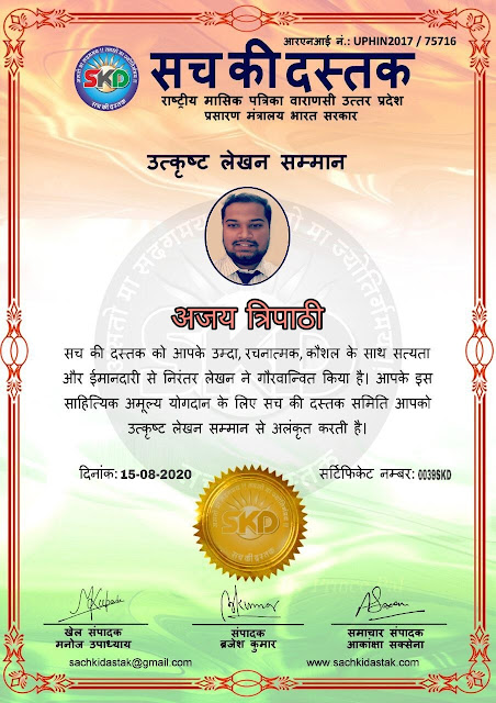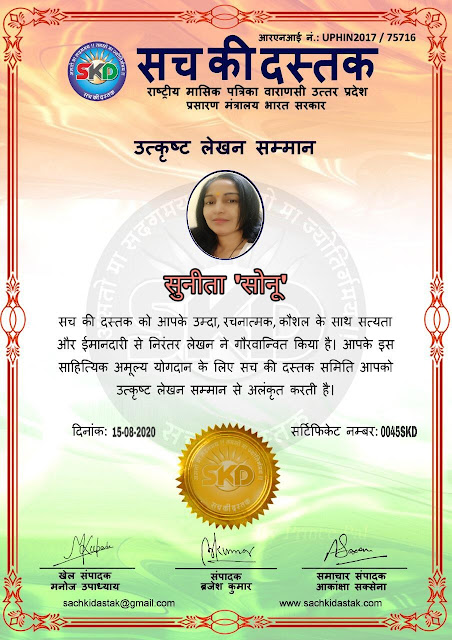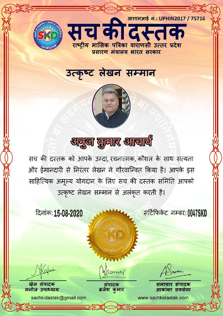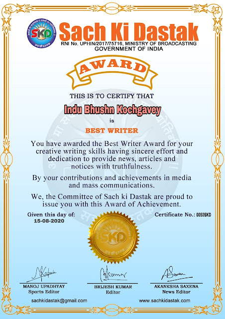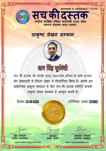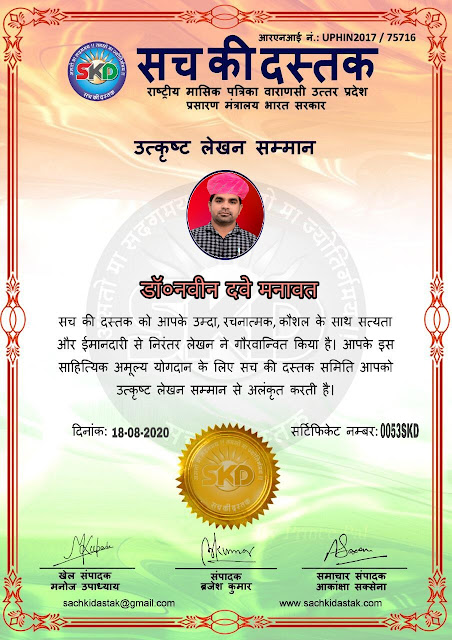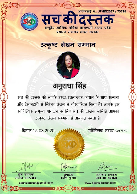 स्वतंत्रता दिवस के पावन अवसर पर सच की दस्तक द्वारा आयोजित गोष्ठी विषय – आत्मनिर्भर भारत बनायें । में सच की दस्तक के कई विद्वान लेखकों ने अपनी उपस्थिति दर्ज करवाई और इस गोष्ठी का संचालन दस्तक के प्रधान संंपादक ब्रजेश कुमार व वाराणसी के महान मनीषी श्री कृष्णकांत श्रीवास्तव जी, इंदुभूषण कोचवे, स्पोर्ट्स एडीटर मनोज उपाध्याय व न्यूज एडीटर आकांक्षा सक्सेना व कई विद्वानों के सानिध्य में आयोजित की गयी जिसमें इसके उपरांत सच की दस्तक के नियमित लेखकों को भी उत्कृष्ट लेखन सम्मान और बेस्ट राईटर अवार्ड से 45 लेखकों को सम्मानित कर,हिंदी साहित्य की सेवा का वचन लेकर कार्यक्रम का समापन हुआ।