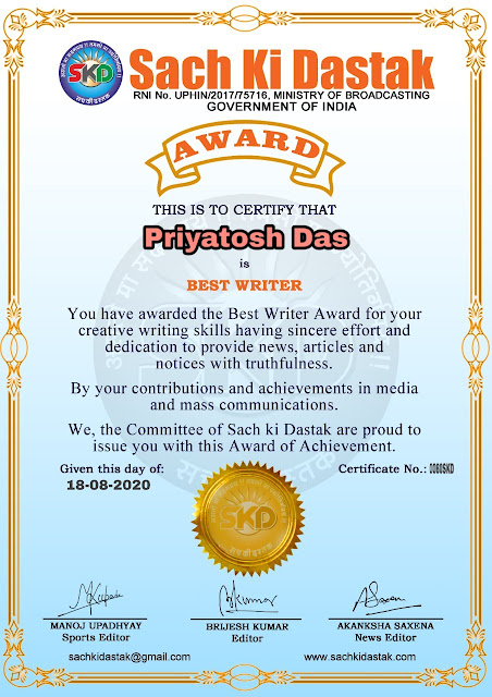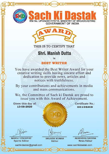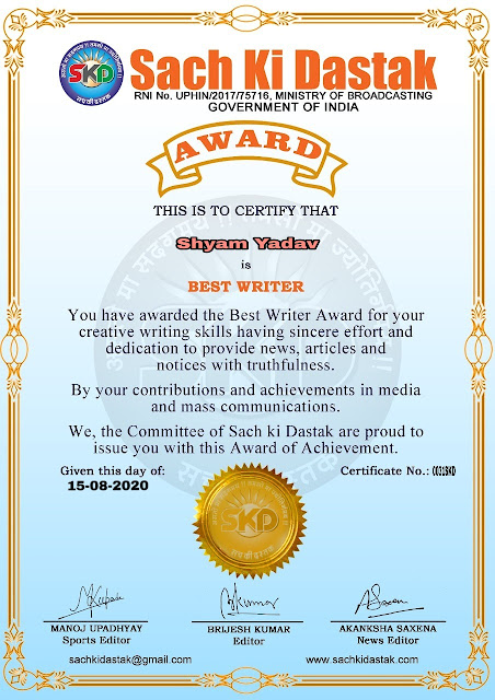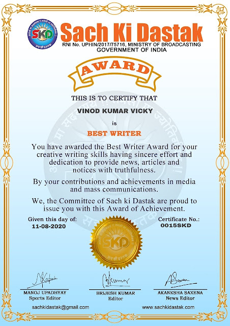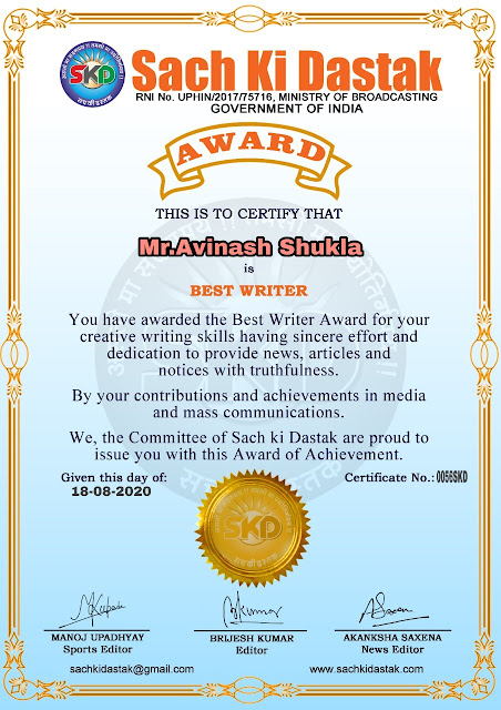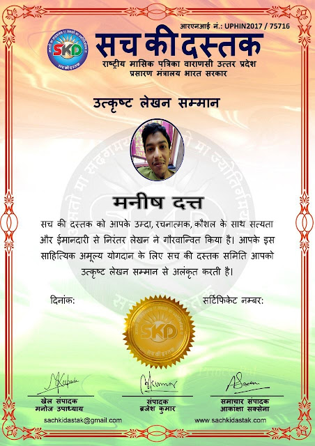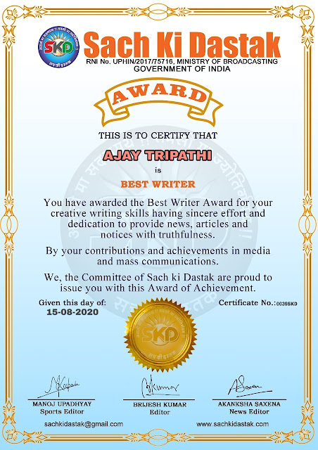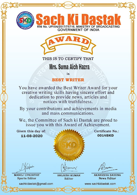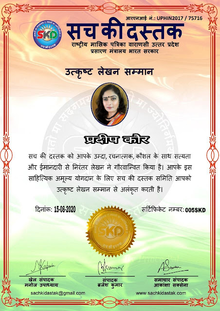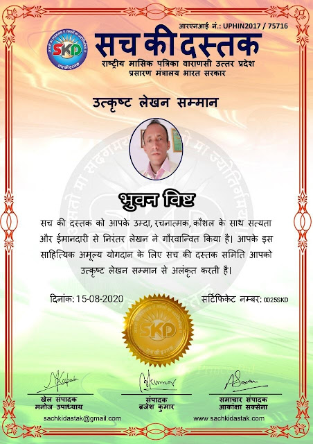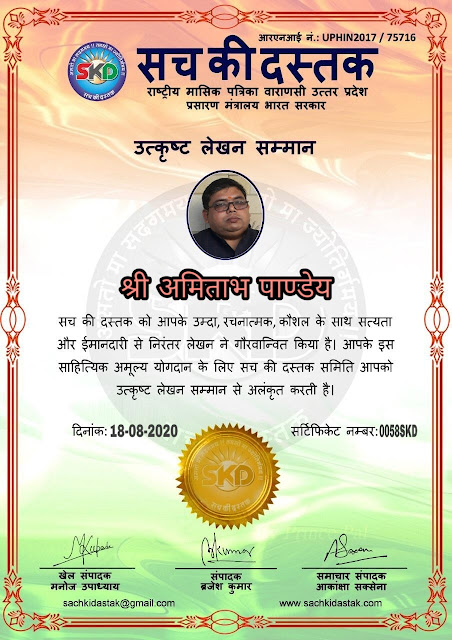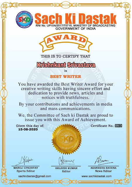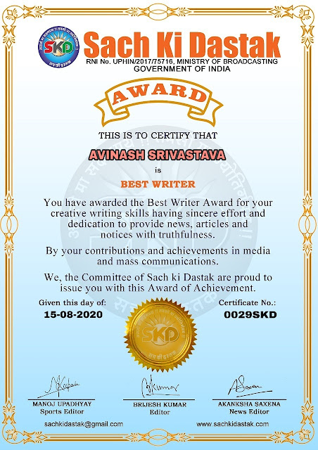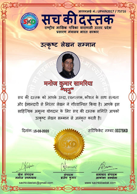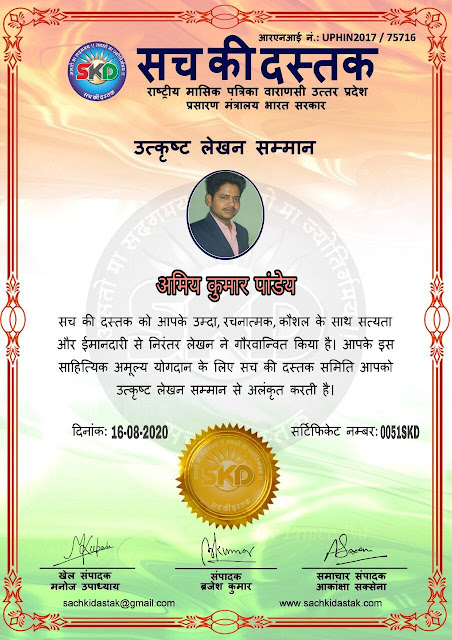 स्वतंत्रता दिवस के पावन अवसर पर सच की दस्तक द्वारा आयोजित गोष्ठी विषय – आत्मनिर्भर भारत बनायें । में सच की दस्तक के कई विद्वान लेखकों ने अपनी उपस्थिति दर्ज करवाई और इस गोष्ठी का संचालन दस्तक के प्रधान संंपादक ब्रजेश कुमार व वाराणसी के महान मनीषी श्री कृष्णकांत श्रीवास्तव जी, इंदुभूषण कोचवे, स्पोर्ट्स एडीटर मनोज उपाध्याय व न्यूज एडीटर आकांक्षा सक्सेना व कई विद्वानों के सानिध्य में आयोजित की गयी जिसमें इसके उपरांत सच की दस्तक के नियमित लेखकों को भी उत्कृष्ट लेखन सम्मान और बेस्ट राईटर अवार्ड से 45 लेखकों को सम्मानित कर,हिंदी साहित्य की सेवा का वचन लेकर कार्यक्रम का समापन हुआ।