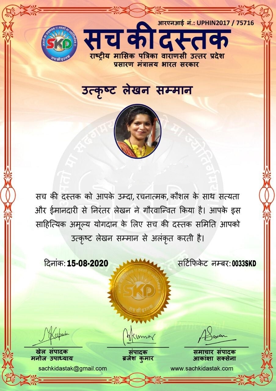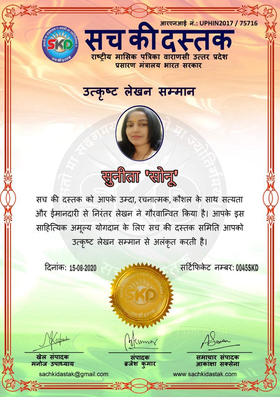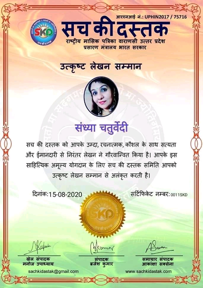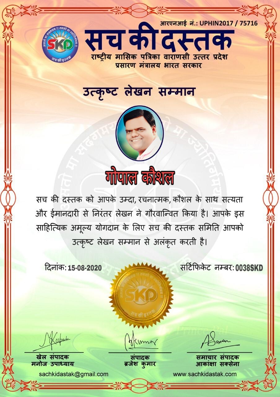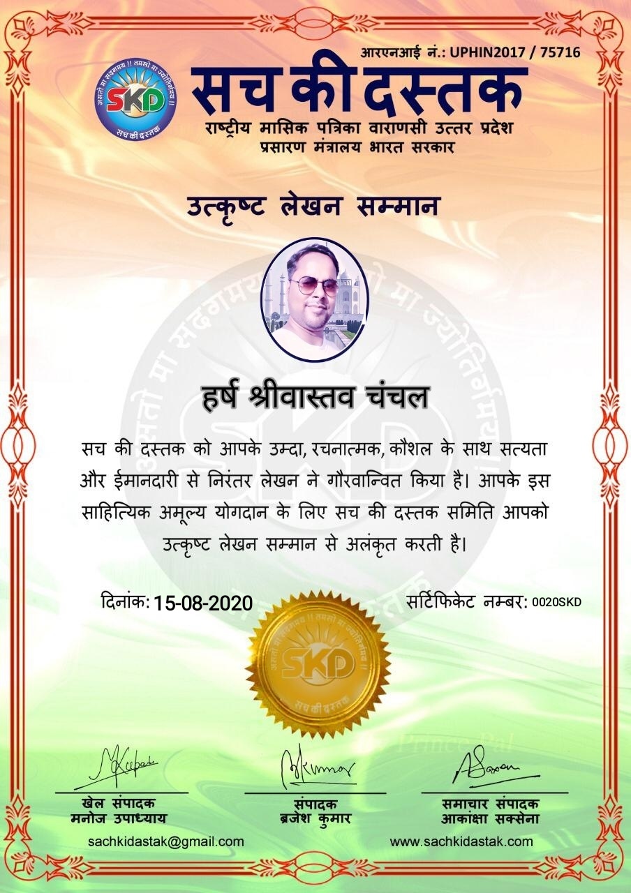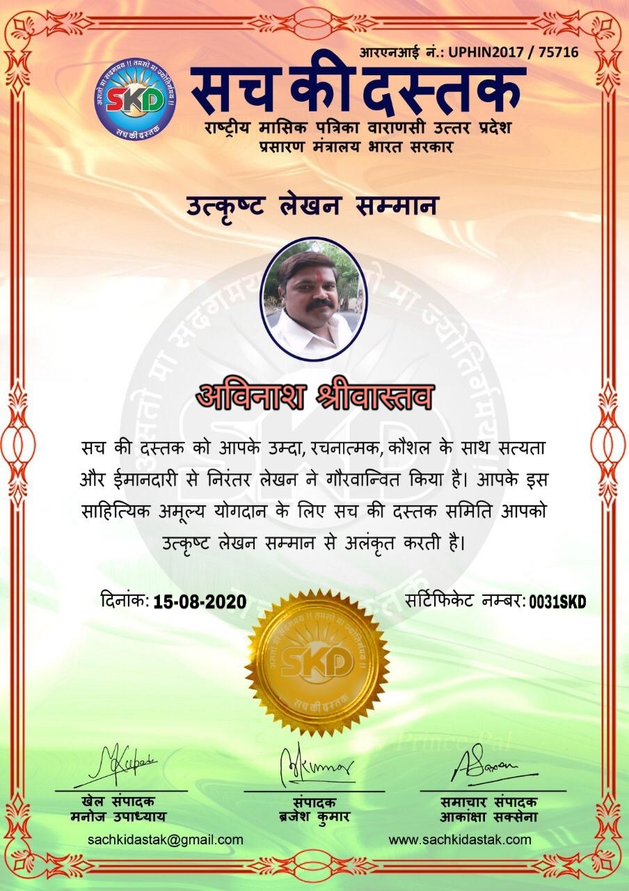 स्वतंत्रता दिवस के पावन अवसर पर सच की दस्तक द्वारा आयोजित गोष्ठी विषय – आत्मनिर्भर भारत बनायें । में सच की दस्तक के कई विद्वान लेखकों ने अपनी उपस्थिति दर्ज करवाई और इस गोष्ठी का संचालन दस्तक के प्रधान संंपादक ब्रजेश कुमार व वाराणसी के महान मनीषी श्री कृष्णकांत श्रीवास्तव जी, इंदुभूषण कोचवे, स्पोर्ट्स एडीटर मनोज उपाध्याय व न्यूज एडीटर आकांक्षा सक्सेना व कई विद्वानों के सानिध्य में आयोजित की गयी जिसमें इसके उपरांत सच की दस्तक के नियमित लेखकों को भी उत्कृष्ट लेखन सम्मान और बेस्ट राईटर अवार्ड से 45 लेखकों को सम्मानित कर,हिंदी साहित्य की सेवा का वचन लेकर कार्यक्रम का समापन हुआ।
