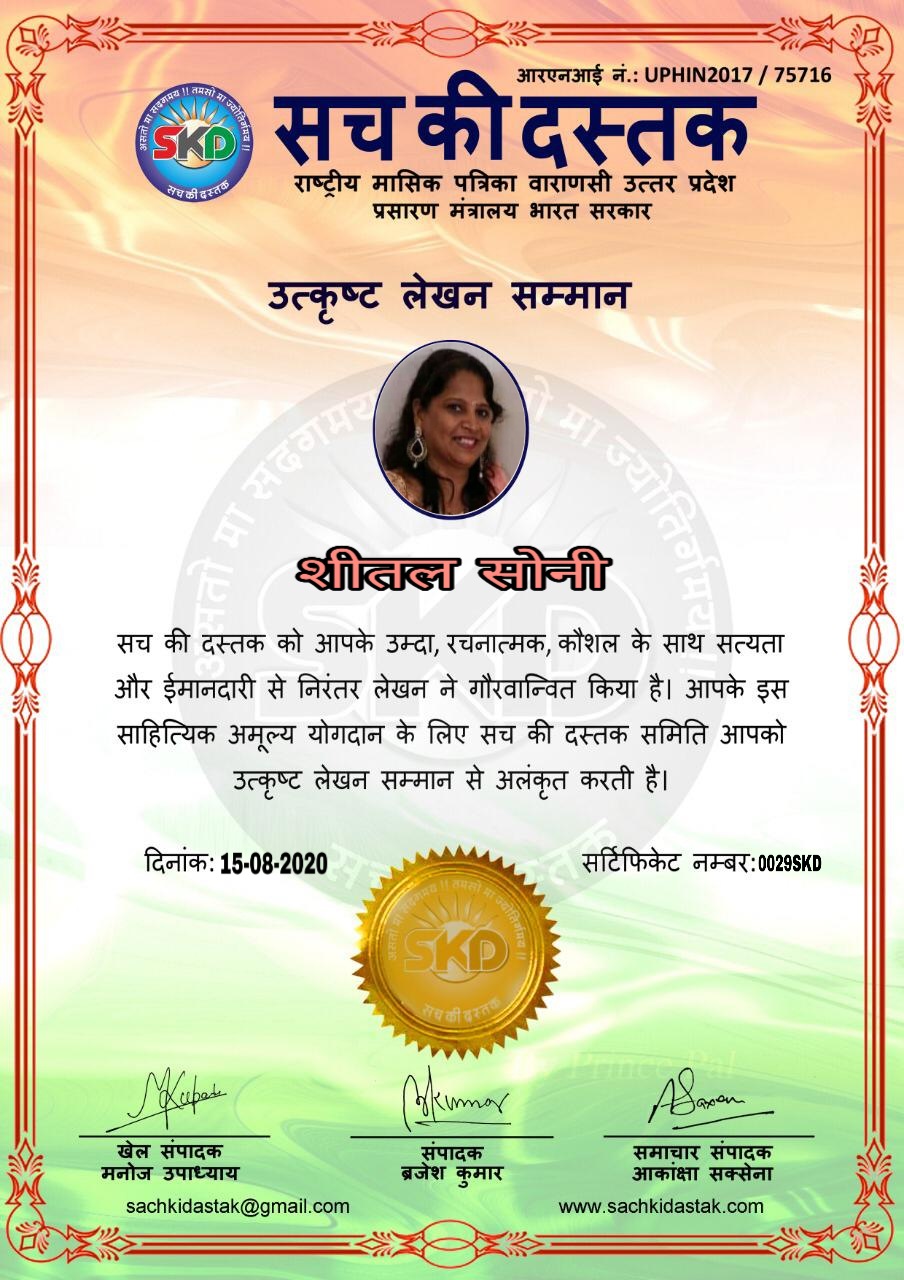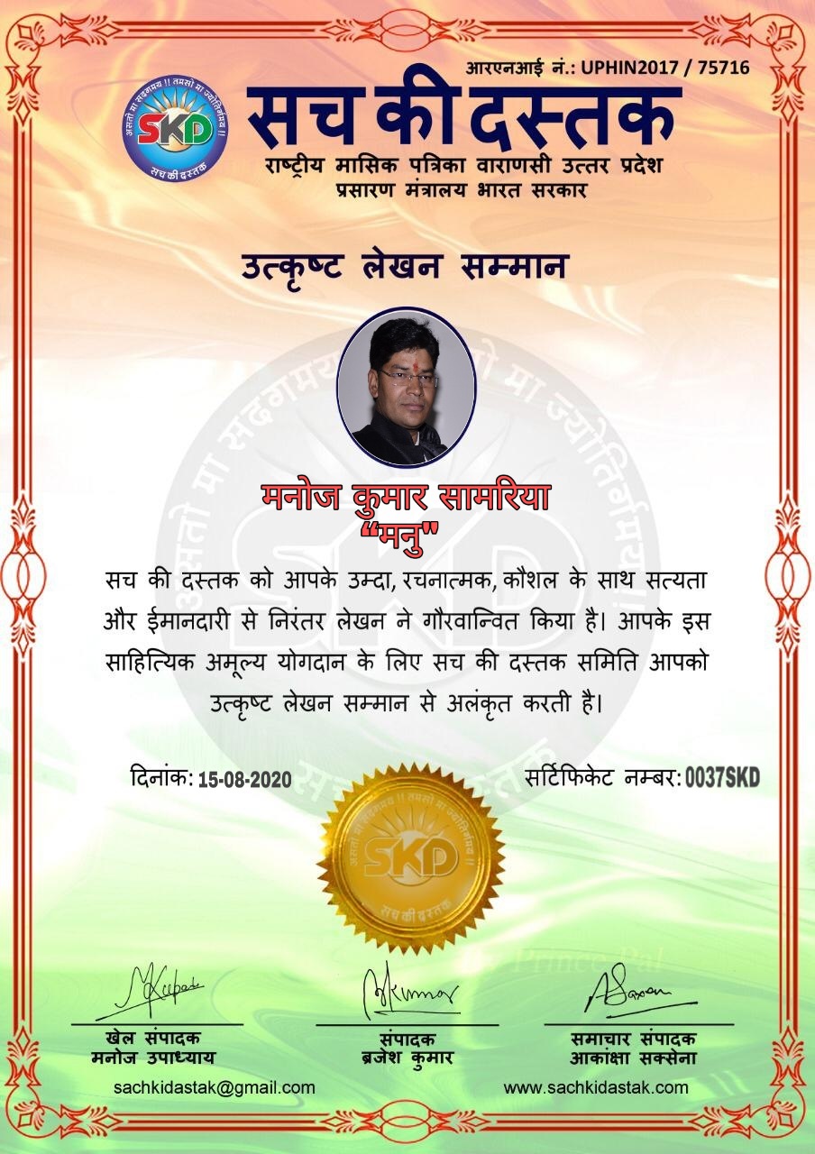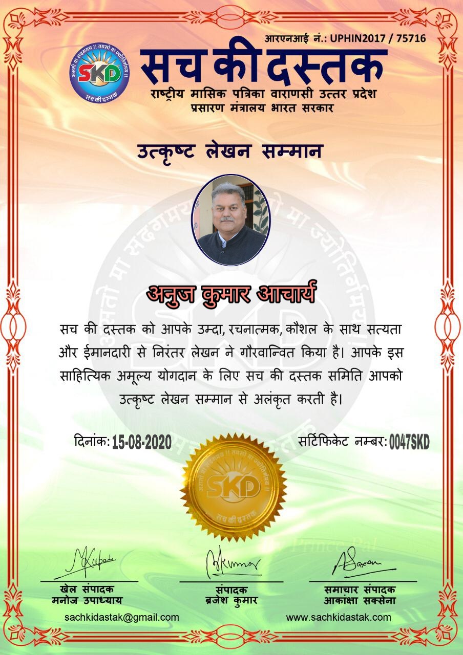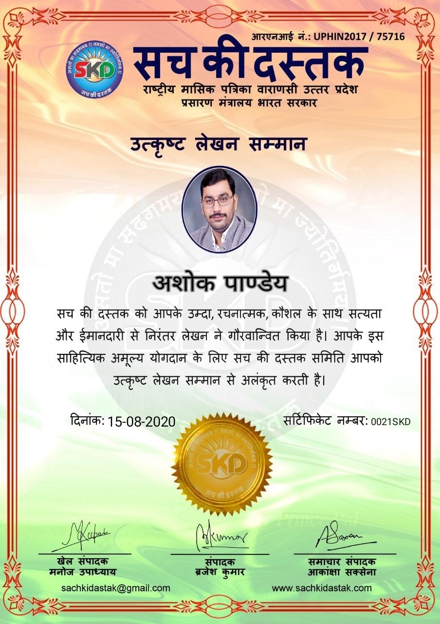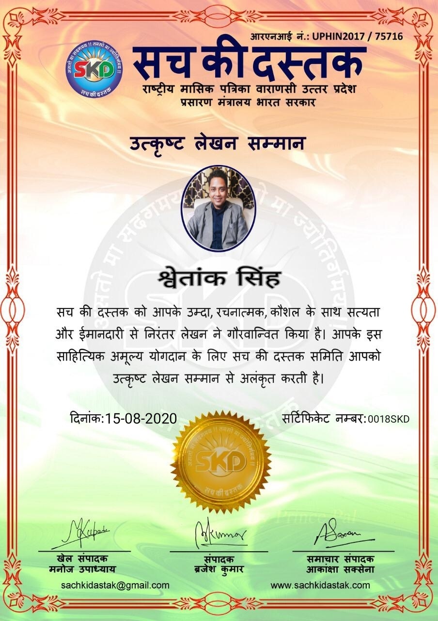 स्वतंत्रता दिवस के पावन अवसर पर सच की दस्तक द्वारा आयोजित गोष्ठी विषय – आत्मनिर्भर भारत बनायें । में सच की दस्तक के कई विद्वान लेखकों ने अपनी उपस्थिति दर्ज करवाई और इस गोष्ठी का संचालन दस्तक के प्रधान संंपादक ब्रजेश कुमार व वाराणसी के महान मनीषी श्री कृष्णकांत श्रीवास्तव जी, इंदुभूषण कोचवे, स्पोर्ट्स एडीटर मनोज उपाध्याय व न्यूज एडीटर आकांक्षा सक्सेना व कई विद्वानों के सानिध्य में आयोजित की गयी जिसमें इसके उपरांत सच की दस्तक के नियमित लेखकों को भी उत्कृष्ट लेखन सम्मान और बेस्ट राईटर अवार्ड से 45 लेखकों को सम्मानित कर,हिंदी साहित्य की सेवा का वचन लेकर कार्यक्रम का समापन हुआ।