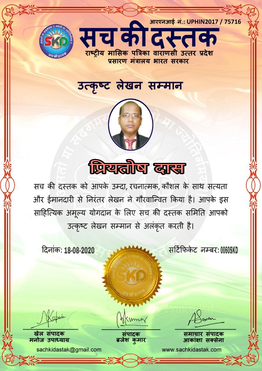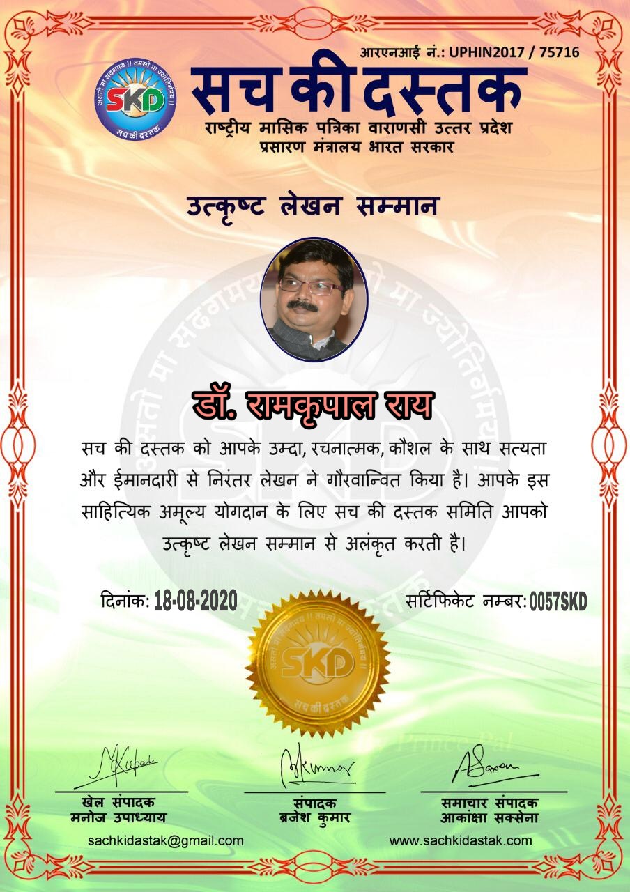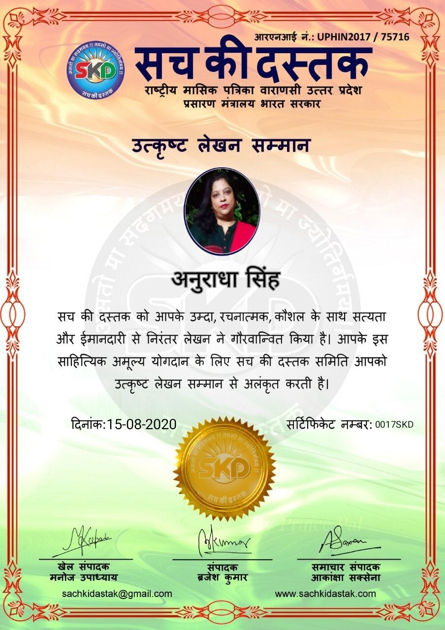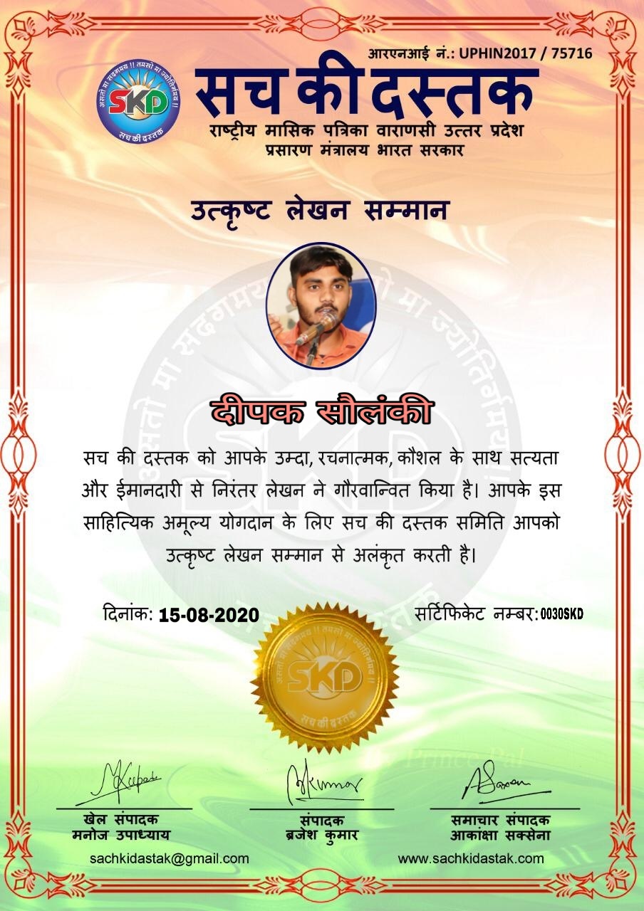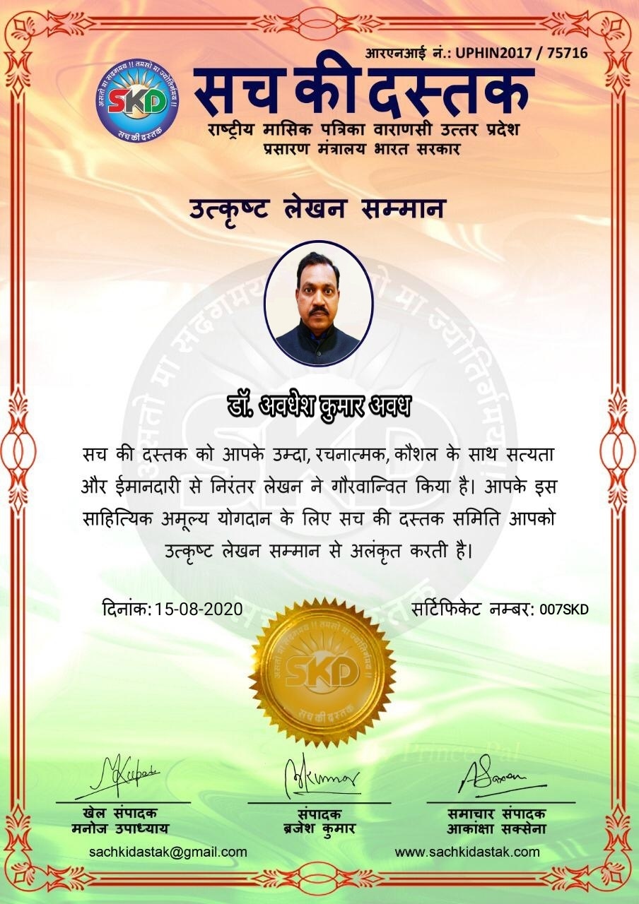 स्वतंत्रता दिवस के पावन अवसर पर सच की दस्तक द्वारा आयोजित गोष्ठी विषय – आत्मनिर्भर भारत बनायें । में सच की दस्तक के कई विद्वान लेखकों ने अपनी उपस्थिति दर्ज करवाई और इस गोष्ठी का संचालन दस्तक के प्रधान संंपादक ब्रजेश कुमार व वाराणसी के महान मनीषी श्री कृष्णकांत श्रीवास्तव जी, इंदुभूषण कोचवे, स्पोर्ट्स एडीटर मनोज उपाध्याय व न्यूज एडीटर आकांक्षा सक्सेना व कई विद्वानों के सानिध्य में आयोजित की गयी जिसमें इसके उपरांत सच की दस्तक के नियमित लेखकों को भी उत्कृष्ट लेखन सम्मान और बेस्ट राईटर अवार्ड से 45 लेखकों को सम्मानित कर,हिंदी साहित्य की सेवा का वचन लेकर कार्यक्रम का समापन हुआ।