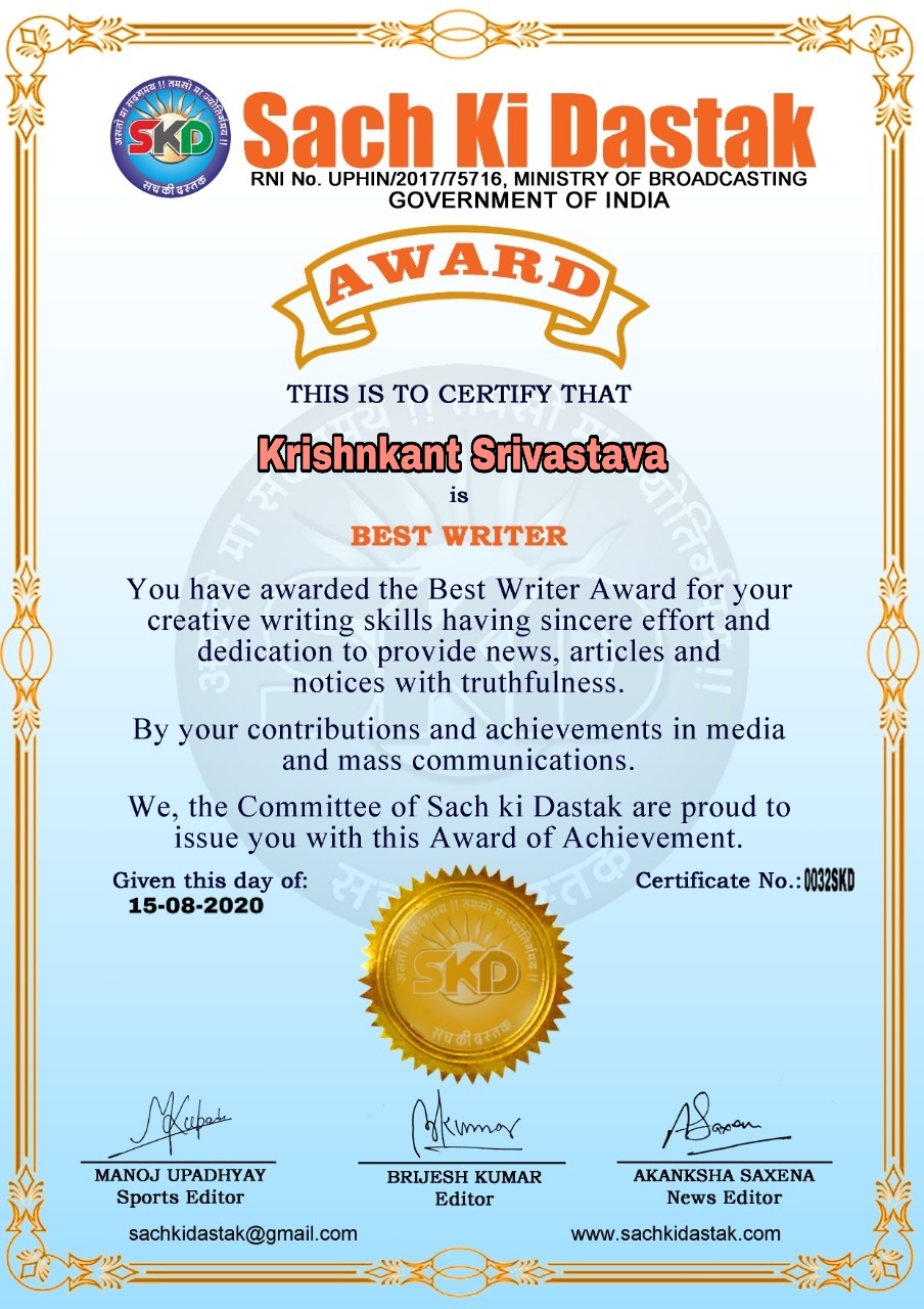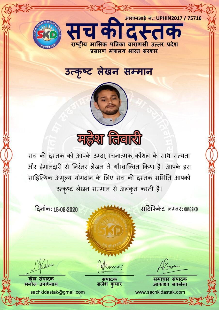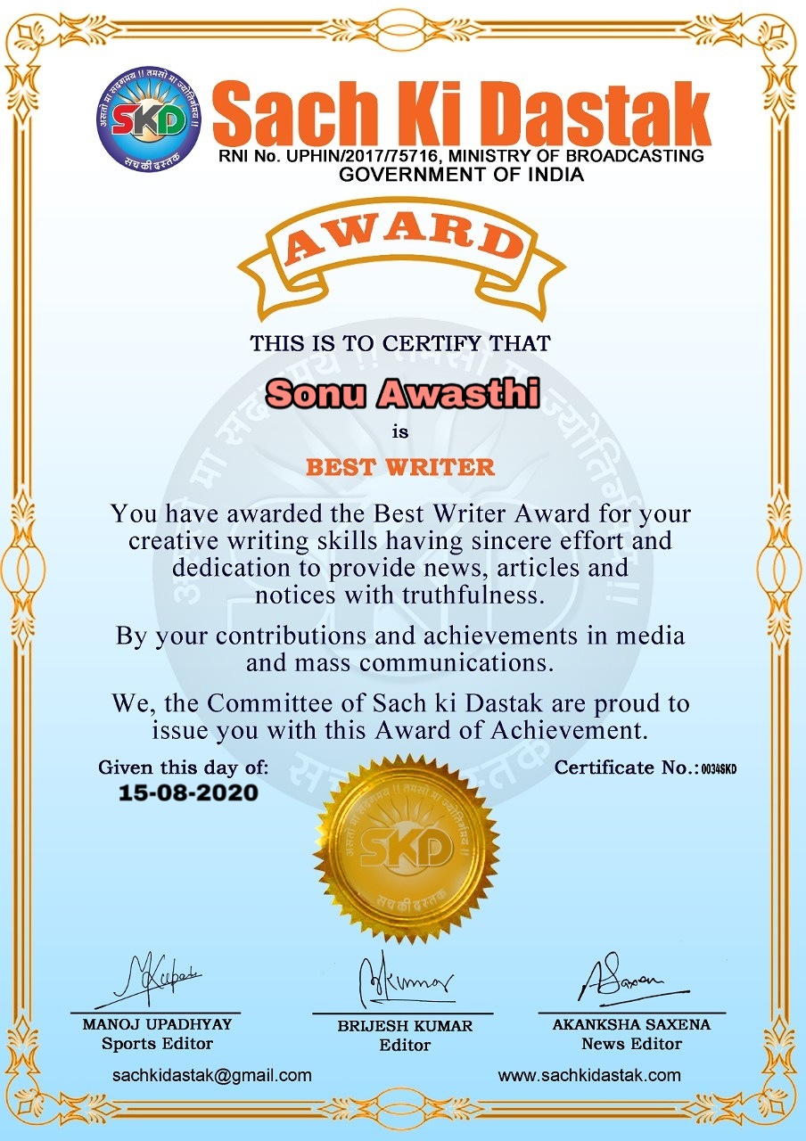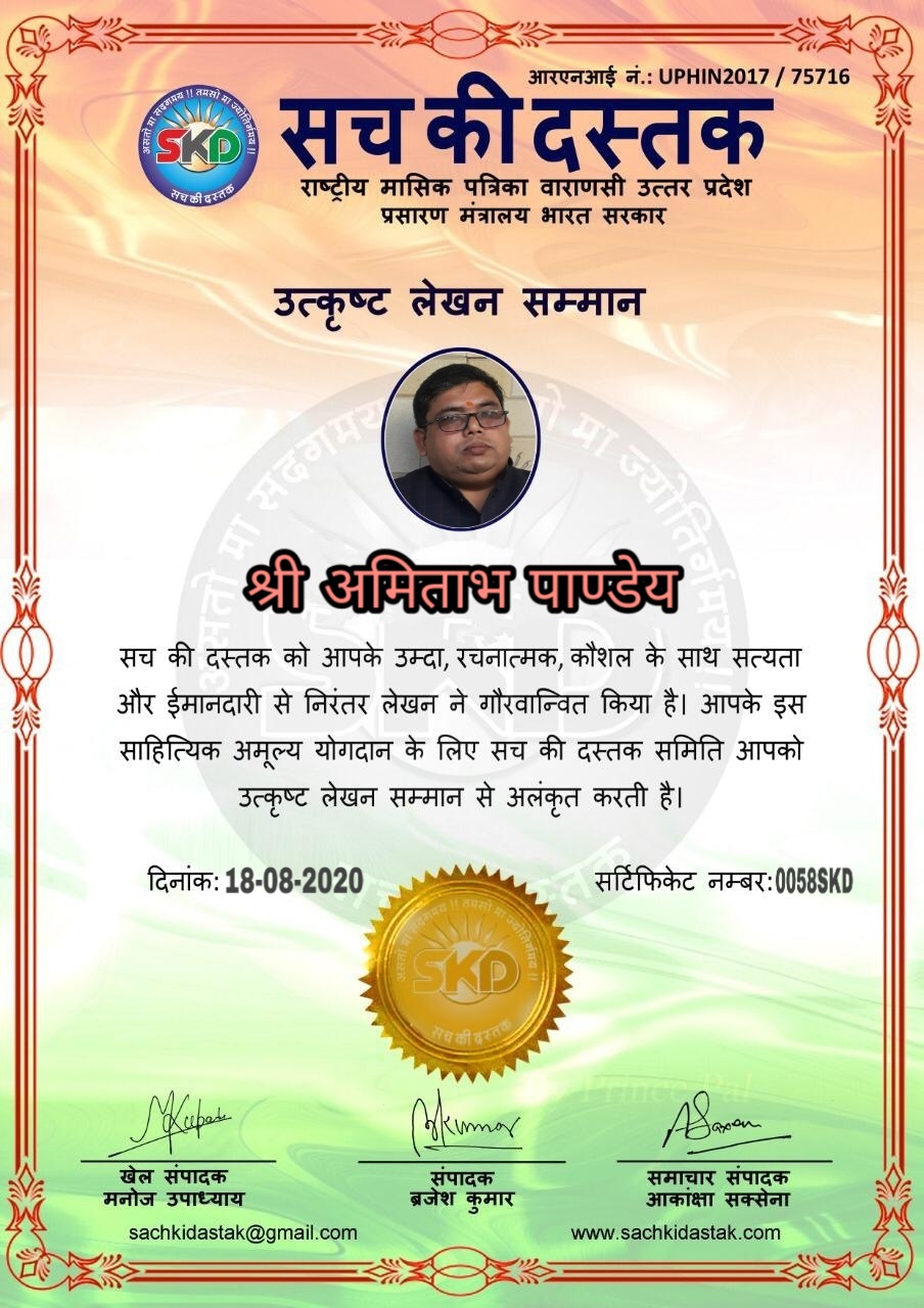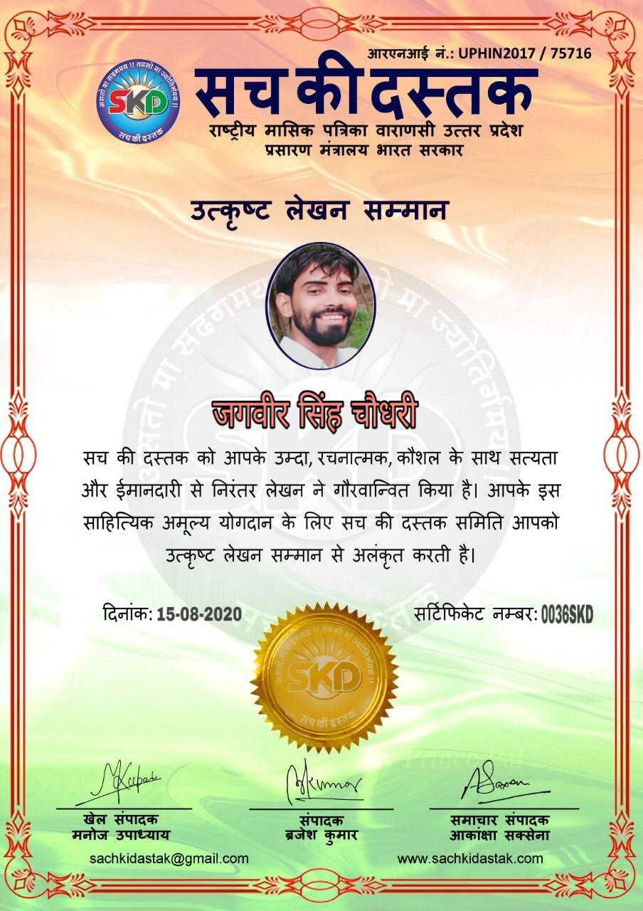 स्वतंत्रता दिवस के पावन अवसर पर सच की दस्तक द्वारा आयोजित गोष्ठी विषय – आत्मनिर्भर भारत बनायें । में सच की दस्तक के कई विद्वान लेखकों ने अपनी उपस्थिति दर्ज करवाई और इस गोष्ठी का संचालन दस्तक के प्रधान संंपादक ब्रजेश कुमार व वाराणसी के महान मनीषी श्री कृष्णकांत श्रीवास्तव जी, इंदुभूषण कोचवे, स्पोर्ट्स एडीटर मनोज उपाध्याय व न्यूज एडीटर आकांक्षा सक्सेना व कई विद्वानों के सानिध्य में आयोजित की गयी जिसमें इसके उपरांत सच की दस्तक के नियमित लेखकों को भी उत्कृष्ट लेखन सम्मान और बेस्ट राईटर अवार्ड से 45 लेखकों को सम्मानित कर,हिंदी साहित्य की सेवा का वचन लेकर कार्यक्रम का समापन हुआ।