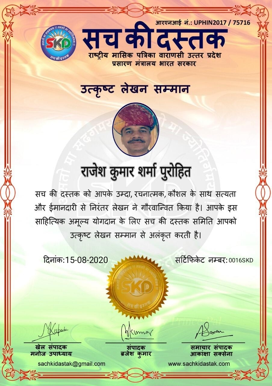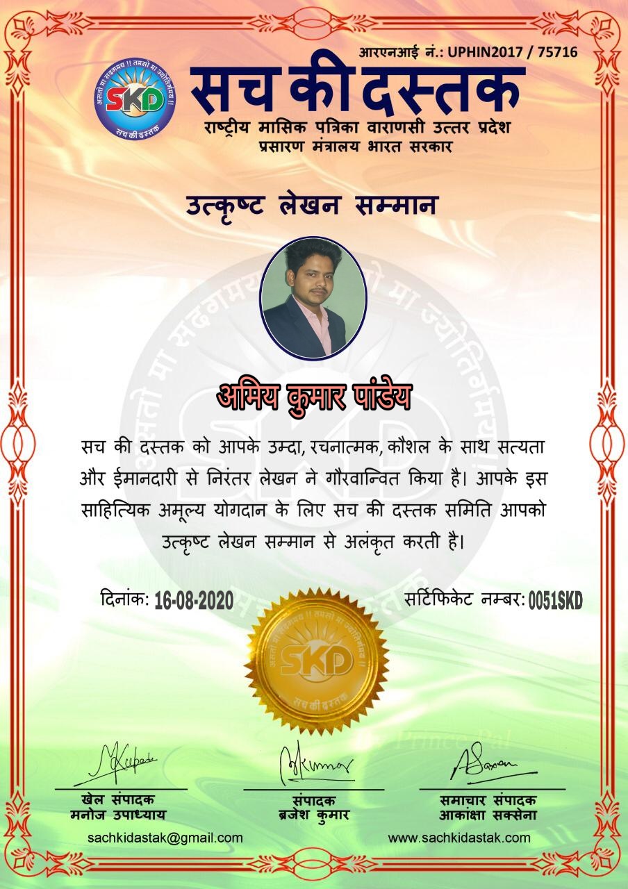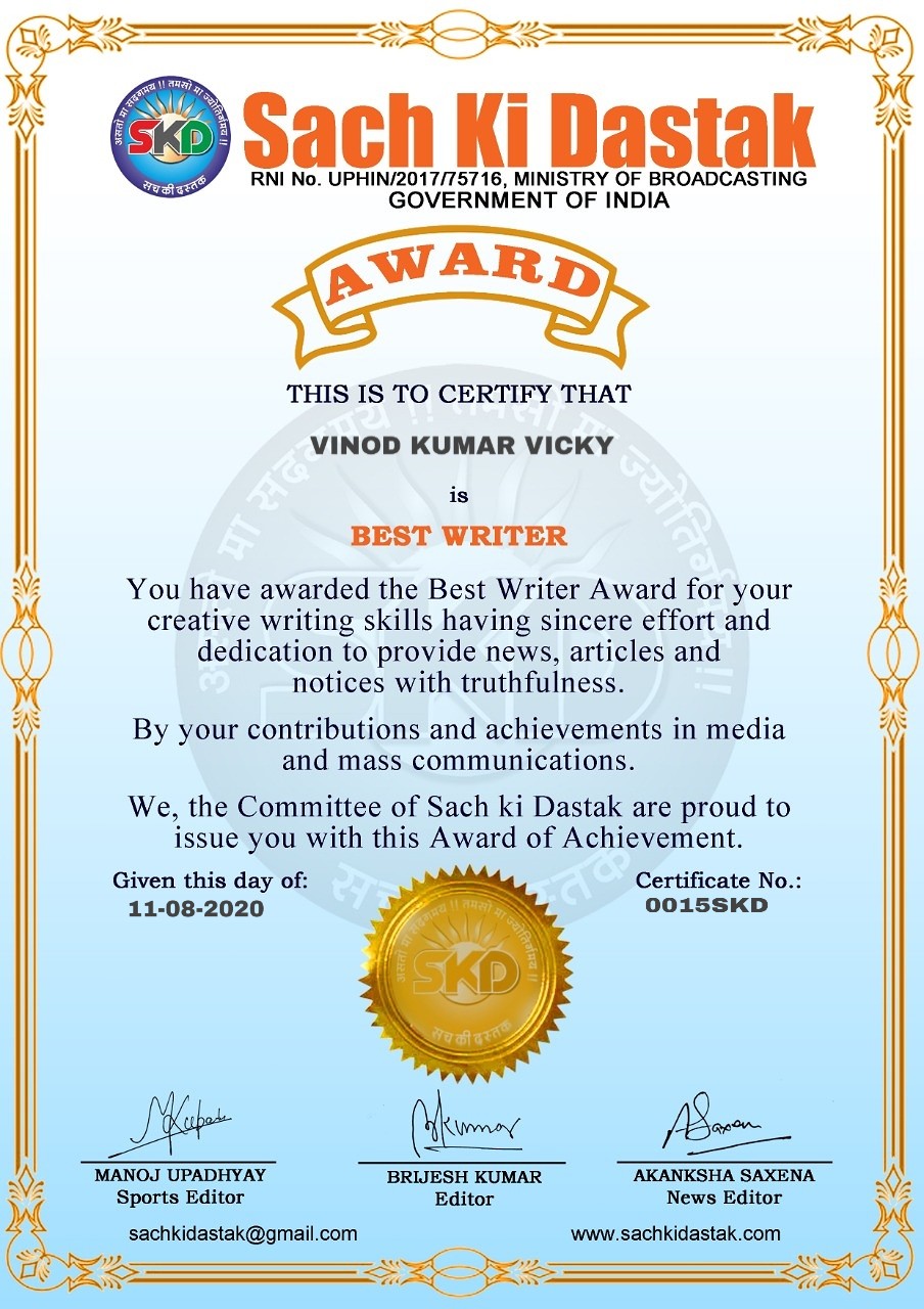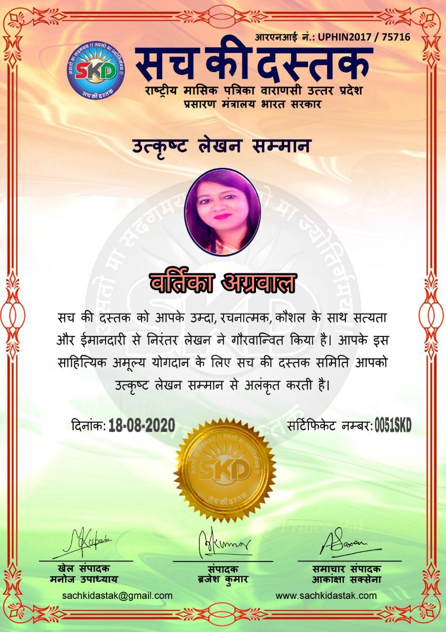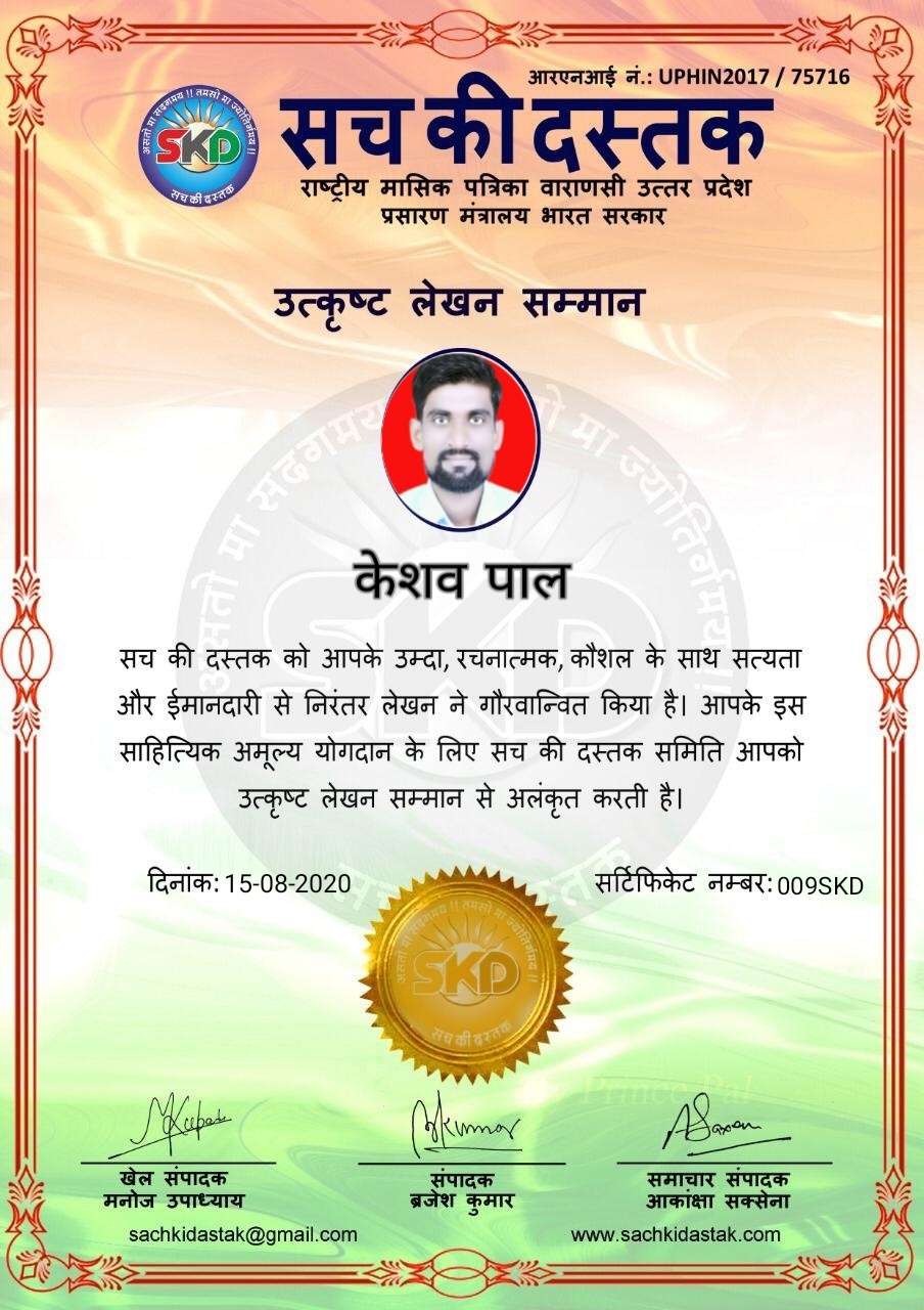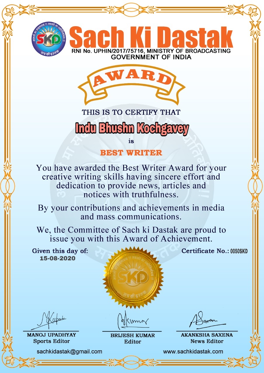 स्वतंत्रता दिवस के पावन अवसर पर सच की दस्तक द्वारा आयोजित गोष्ठी विषय – आत्मनिर्भर भारत बनायें । में सच की दस्तक के कई विद्वान लेखकों ने अपनी उपस्थिति दर्ज करवाई और इस गोष्ठी का संचालन दस्तक के प्रधान संंपादक ब्रजेश कुमार व वाराणसी के महान मनीषी श्री कृष्णकांत श्रीवास्तव जी, इंदुभूषण कोचवे, स्पोर्ट्स एडीटर मनोज उपाध्याय व न्यूज एडीटर आकांक्षा सक्सेना व कई विद्वानों के सानिध्य में आयोजित की गयी जिसमें इसके उपरांत सच की दस्तक के नियमित लेखकों को भी उत्कृष्ट लेखन सम्मान और बेस्ट राईटर अवार्ड से 45 लेखकों को सम्मानित कर,हिंदी साहित्य की सेवा का वचन लेकर कार्यक्रम का समापन हुआ।