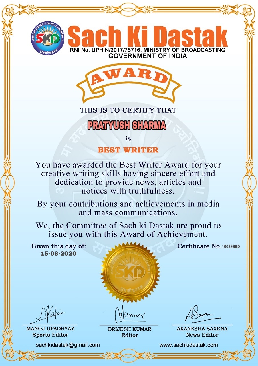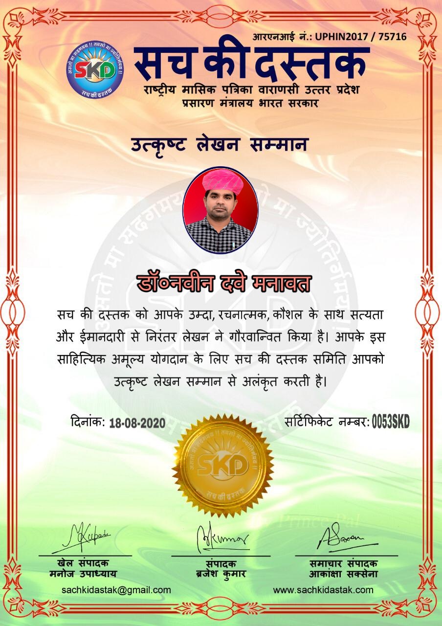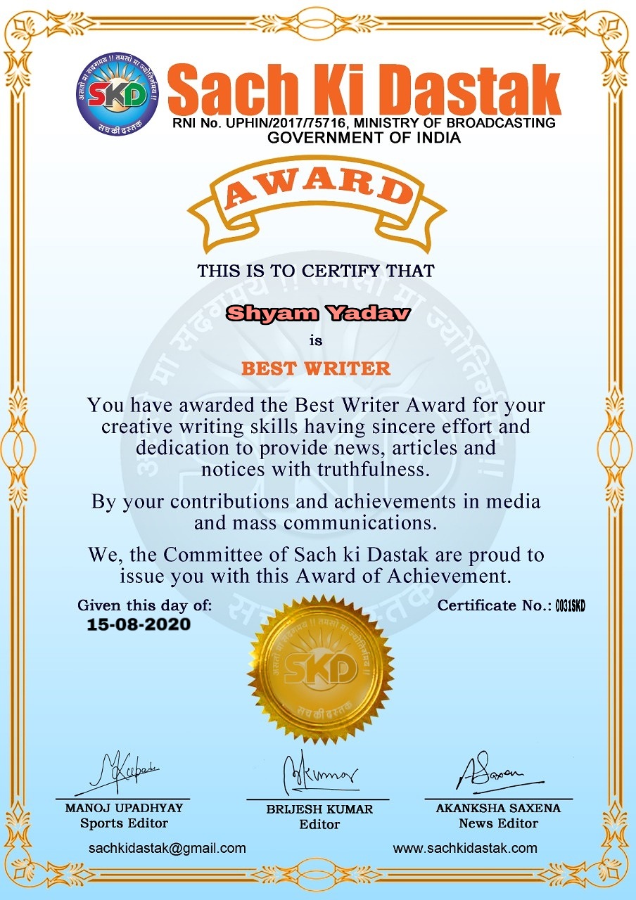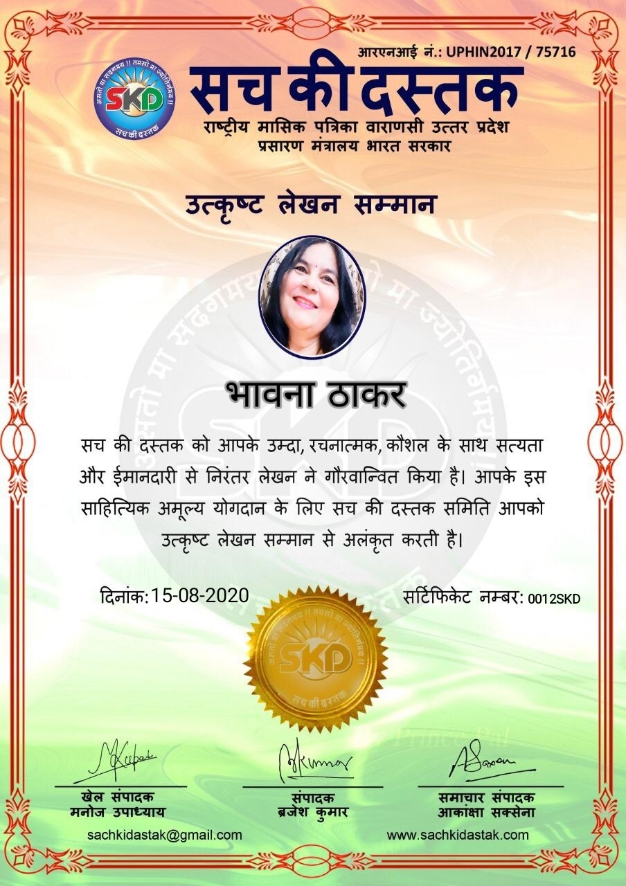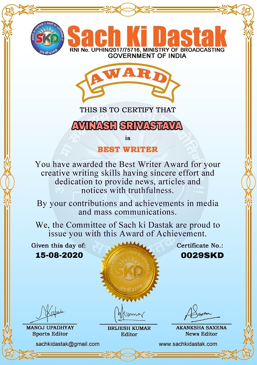 स्वतंत्रता दिवस के पावन अवसर पर सच की दस्तक द्वारा आयोजित गोष्ठी विषय – आत्मनिर्भर भारत बनायें । में सच की दस्तक के कई विद्वान लेखकों ने अपनी उपस्थिति दर्ज करवाई और इस गोष्ठी का संचालन दस्तक के प्रधान संंपादक ब्रजेश कुमार व वाराणसी के महान मनीषी श्री कृष्णकांत श्रीवास्तव जी, इंदुभूषण कोचवे, स्पोर्ट्स एडीटर मनोज उपाध्याय व न्यूज एडीटर आकांक्षा सक्सेना व कई विद्वानों के सानिध्य में आयोजित की गयी जिसमें इसके उपरांत सच की दस्तक के नियमित लेखकों को भी उत्कृष्ट लेखन सम्मान और बेस्ट राईटर अवार्ड से 45 लेखकों को सम्मानित कर,हिंदी साहित्य की सेवा का वचन लेकर कार्यक्रम का समापन हुआ।