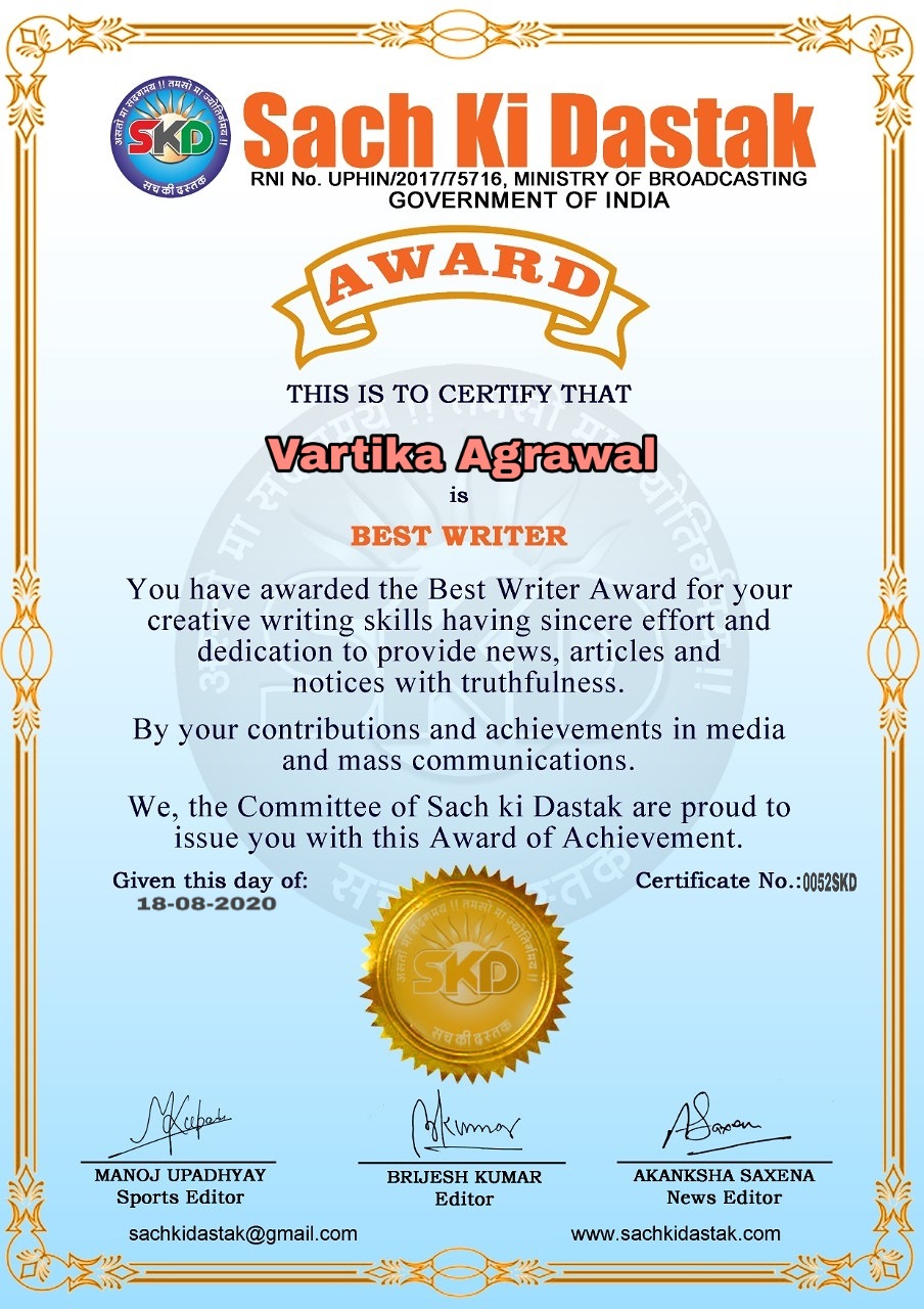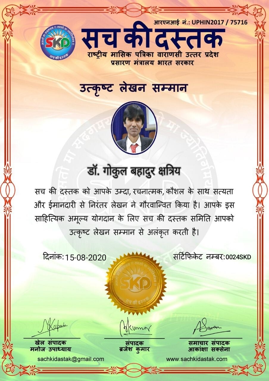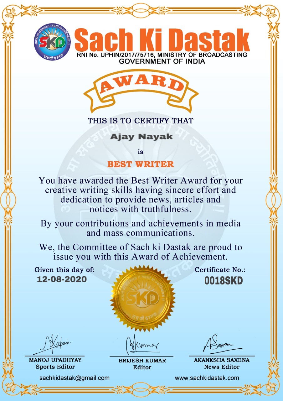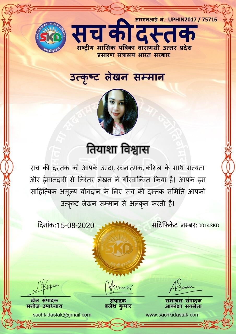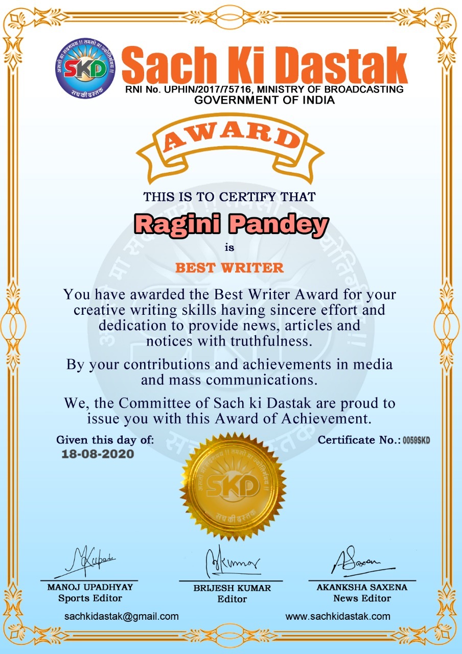 स्वतंत्रता दिवस के पावन अवसर पर सच की दस्तक द्वारा आयोजित गोष्ठी विषय – आत्मनिर्भर भारत बनायें । में सच की दस्तक के कई विद्वान लेखकों ने अपनी उपस्थिति दर्ज करवाई और इस गोष्ठी का संचालन दस्तक के प्रधान संंपादक ब्रजेश कुमार व वाराणसी के महान मनीषी श्री कृष्णकांत श्रीवास्तव जी, इंदुभूषण कोचवे, स्पोर्ट्स एडीटर मनोज उपाध्याय व न्यूज एडीटर आकांक्षा सक्सेना व कई विद्वानों के सानिध्य में आयोजित की गयी जिसमें इसके उपरांत सच की दस्तक के नियमित लेखकों को भी उत्कृष्ट लेखन सम्मान और बेस्ट राईटर अवार्ड से 45 लेखकों को सम्मानित कर,हिंदी साहित्य की सेवा का वचन लेकर कार्यक्रम का समापन हुआ।