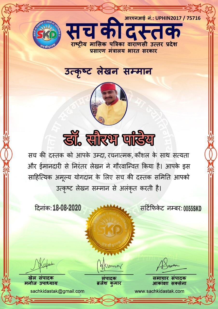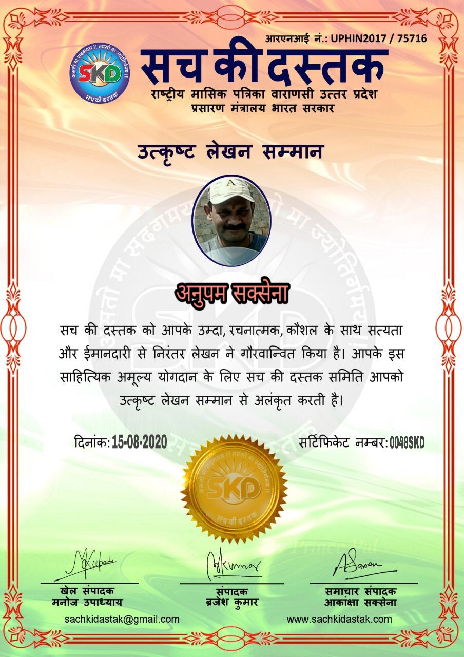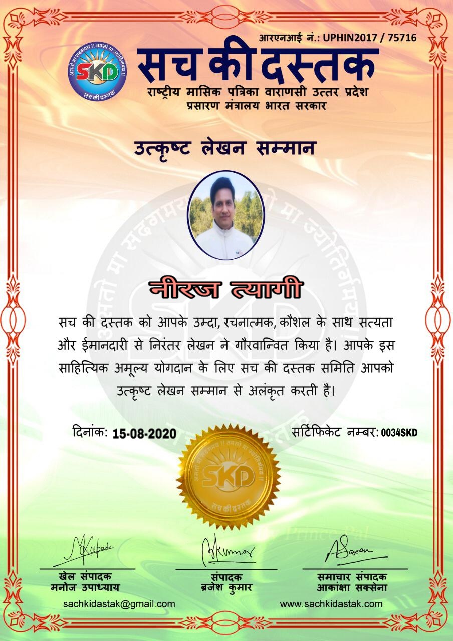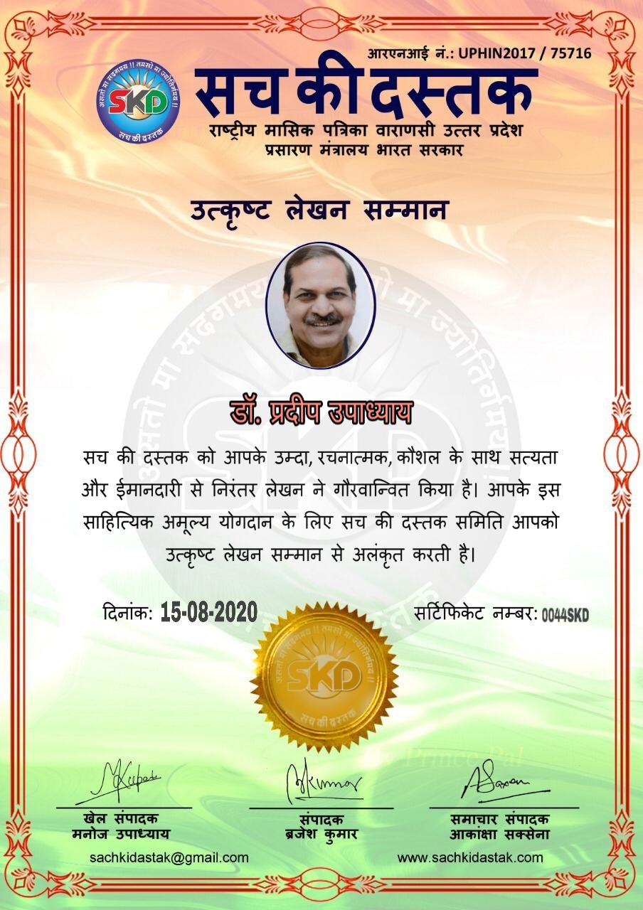 स्वतंत्रता दिवस पर सच की दस्तक द्वारा 45 लेखकों को सम्मानित किया