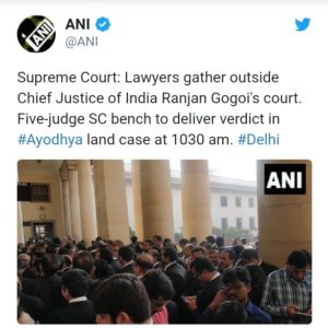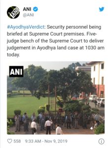 अयोध्या में विवादित जमीन पर मालिकाना हक संबंधी मुकदमे में उच्चतम न्यायालय की पीठ शनिवार पूर्वाह्न 10:30 बजे अपना फैसला सुनाएगी। न्यायालय परिसर के आसपास बड़ी संख्या में सुरक्षा कर्मियों की तैनाती की गई है और सभी वाहनों तथा राहगीरों की भी पूरी जांच की जा रही है।
