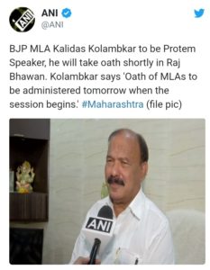 भाजपा विधायक कालीदास कोलाम्बकर को महाराष्ट्र विधानसभा का प्रोटेम स्पीकर नियुक्त किया गया है। इससे पहले महाराष्ट्र में एक महीने से चल रहे राजनीतिक ड्रामे में मंगलवार को नया मोड़ आ गया जब भाजपा नेता देवेंद्र फडणवीस ने राज्यपाल भगत सिंह कोश्यारी को अपना इस्तीफा सौंप दिया।