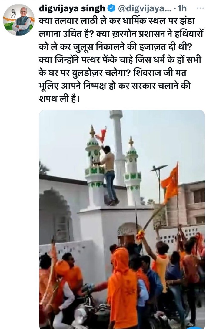 गौरतलब है कि खरगोन हिंसा को हिंदू साम्प्रदायिकता और मुस्लिमों को पीड़ित दिखाने की कोशिशों के तहत दिग्विजय सिंह ने ट्वीट किया था, “क्या तलवार लाठी लेकर धार्मिक स्थल पर झंडा लगाना उचित है। क्या खरगोन प्रशासन ने हथियारों को लेकर जुलूस निकालने की इजाजत दी थी? क्या जिन्होंने पत्थर फेंके चाहे वो जिस भी धर्म के हों, सभी के घर पर बुलडोजर चलेगा? शिवराज जी मत भूलिए.. आपने निष्पक्ष होकर सरकार चलाने की शपथ ली है।”