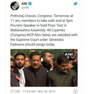 चव्हाण ने आगे कहा कि सुप्रीम कोर्ट ने हमारी मांग सुप्रीम कोर्ट ने मान ली। हम इस फैसले से पूरी तरह संतुष्ट हैं। फडणवीस को अब इस्तीफा दे देना चाहिए। आपको बता दें कि कोर्ट ने महाराष्ट्र के राज्यपाल को निर्देश दिया कि वह 27 नवंबर को राज्य विधानसभा में शक्ति परीक्षण सुनिश्चित करें। अब महाराष्ट्र के मुख्यमंत्री देवेंद्र फडणवीस को बुधवार को विधानसभा में बहुमत साबित करना होगा।