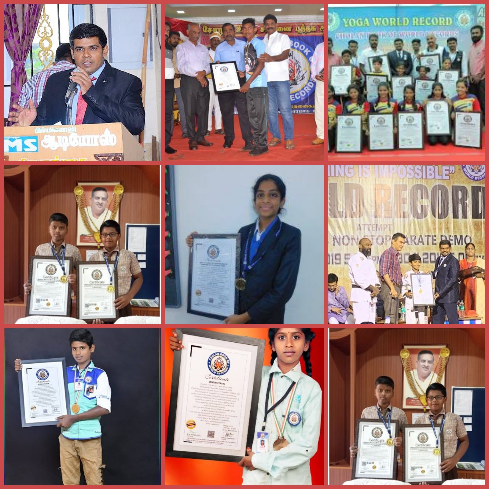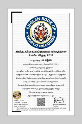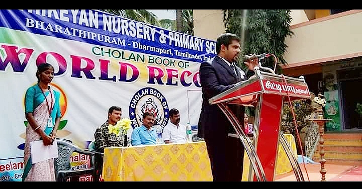 The “Cholan book of world records” was traditionally started by the Sivagangai district collector Mr. J. Jeyakanthan I.A.S, and the district superintendent of police Mr. D.Jeyachandran I.P.S, on 2nd of February 2019. 17 world records were set on the same stage on the sane day. The purpose of this world record book is to encourage and recognize talents and to let them realize talent as a self-contained inventor and a righteous person.
