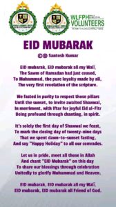 आपसी भेदभाव को मिटा कर,प्यार और अमन चैन से गंगा जमुनी तहजीब वाली विरासत को संजोने में आप सभी गले लगे, और कंधे से कंधा मिलाकर, आपस में सौहार्द और खुशियां परोसे और सच्चे ईद की सार्थकता को मुबारक बनाये।।-Dr Arif Nasir Butt