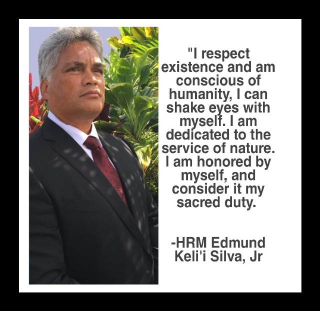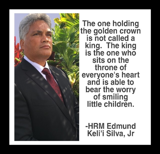 Queen Emma prophesied that a sacred child (Ni‘au pi‘o, or sanctified lines) would come forward to restore The Kingdom of Hawai‘i. It was determined by the Council that Edmund Keli‘i Silva Jr. was that child and Mikahala Roy, the King’s royal Kapuna, announced the King’s sacred Hawaiian name to be: