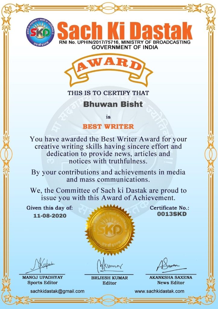 सच की दस्तक द्वारा ‘बेस्ट राईटर अवार्ड’ से सम्मानित हुए देशी- विदेशी लेखक