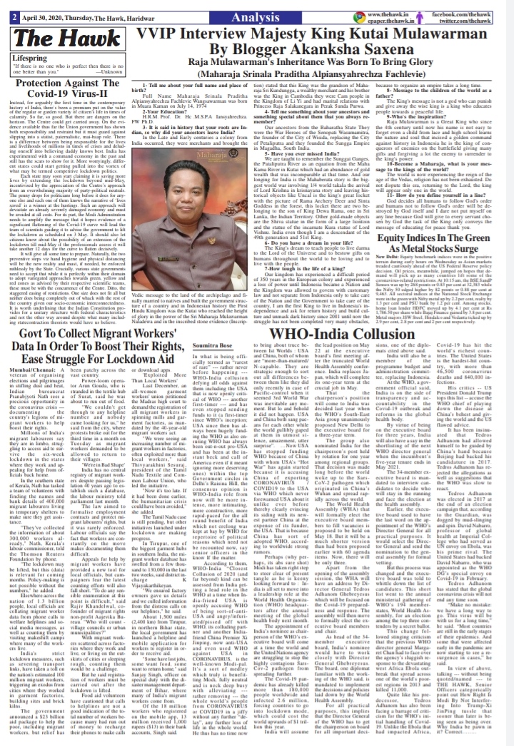 हमने कहा महामहिम आप विश्व शांति और मानवाधिकार पर भरोसा करने वाले राजा हैं कृपया विश्व शांति में कुछ संदेश दीजिए। तब उन्होंने कहा कि- दुनिया अब वेदों के युग के शासनकाल का अनुभव कर रही है, धर्म समाप्त नहीं हुआ है। इस युग में विवाद मत करो, भगवान के पास लौटकर जाना है।अंत में यही कहूंगा कि जब आप कहते हैं कि अच्छा काम करने का समय नहीं है क्योंकि जीवन बहुत व्यस्त है, तो आप अपने आप को उस विशाल अस्तित्व से दूर कर लेते हैं जो अनसुलझे रहस्य को जोड़ने और सुलझाने के लिए बनाया गया था। शिक्षित बनें और मानवता का सम्मान करें।
