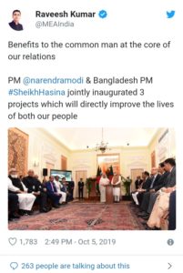 मोदी ने कहा कि भारत बांग्लादेश के साथ अपनी साझेदारी को प्राथमिकता देता है। भारत-बांग्लादेश संबंध दो मित्र पड़ोसी देशों के बीच सहयोग का पूरी दुनिया के लिए एक बेहतरीन उदाहरण है। उन्होंने कहा कि शनिवार की वार्ता भारत और बांग्लादेश के बीच संबंधों को और मजबूत करेगी। संयुक्त बयान के अनुसार हसीना ने कहा कि बांग्लादेश के लोग तीस्ता जल बंटवारा समझौते शीघ्र होने की बाट जोह रहे हैं जिस पर 2011 में दोनों देशों की सरकारों के बीच सहमति हुई थी। मोदी ने हसीना से कहा कि उनकी सरकार यथाशीघ्र यह समझौता करने के लिए भारत में सभी संबंधित पक्षों के साथ मिलकर काम कर रही है। दोनों देशों ने सात समझौतों पर हस्ताक्षर किये जो जल संसाधन, युवा मामलों, संस्कृति, शिक्षा और तटीय निगरानी से संबंधित है।