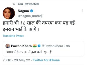 कांग्रेस नेता नगमा ने पवन खेड़ा के ट्वीट को रिट्वीट करते हुए कहा है कि हमारी भी 18 साल की तपस्या इमरान प्रतापगढ़ी के आगे कम पड़ गई. इन दोनों नेताओं ने राज्यसभा चुनाव के लिए टिकटों के ऐलान पर ज्यादा कुछ तो नहीं कहा है, लेकिन कम शब्दों में ही ये संदेश जरूर दे दिया है कि टिकट वितरण में इनकी अनदेखी की गई है.