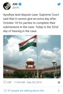 बता दें कि इससे पहले भी चीफ जस्टिस रंजन गोगोई इस बात पर टिप्पणी कर चुके हैं कि सभी पक्षों को कोशिश करनी चाहिए कि 18 अक्टूबर तक अयोध्या मामले की सुनवाई पूरी हो सके।इसके बाद क्योंकि सुप्रीम कोर्ट को एक महीने का वक्त इस मसले का फैसला लिखने के लिए चाहिए होगा।