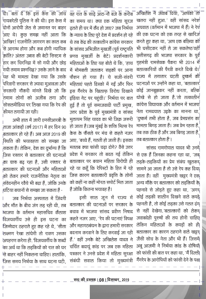 अभी हाल में जारी एनसीआरबी के ताजा आंकड़ों (वर्ष 2017) में हर दिन 90 बलात्कार हो रहे हैं। अब आज 2019 की स्थिति की भयावहता को समझा जा सकता है। लेकिन, देश का दुर्भाग्य है कि जिस रफ्तार से बलात्कार की घटनाओं का ग्राफ बढ़ रहा है, उसी रफ्तार से बलात्कार की घटनाओं और महिलाओं को लेकर हमारे राजनीतिक नेतृत्व का संवेदनहीन रवैये भी बढा है, जोकि उनके घटिया बयानों से समझा जा सकता है –