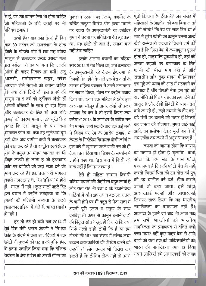 अभी हैदराबाद कांड के दो ही दिन बाद 30 नवंबर को राजस्थान के टोंक जिले के खेड़ली गांव में एक छह वर्षीय मासूस से बलात्कार करके उसका गला इस बर्बरता से दबाया गया कि उसकी आंखें ही बाहर निकल आ गयीं। अबू आजमी, मनोहरलाल खट्टर, नरेश अग्रवाल जैसे नेताओं को बताना चाहिए कि क्या टोंक जिले की इस 6 वर्ष की मासूम या 5 वर्ष की ट्वींकल जैंसी हीं अनेकों बच्चियों के साथ हो रही हिंसा और बलात्कार के लिए भी क्या छोटे कपड़ों को कारण माना जाए? सुरेंद्र सिंह बताएं कि उस मासूम के पास क्या मोबाइल फोन था, क्या वह खुलेआम घूम रही थी? जब ग्रामीण क्षेत्रों में बलात्कार की बात कर रहे हैं तो राष्ट्रीय स्वयंसेवक संघ के प्रमुख उन मोहन भागवत का भी जिक्र जरूरी हो जाता है जो हैदराबाद कांड पर दोषियों को कड़ी सजा देने की मांग कर रहे हैं। एक वक्त यही भागवत कहते नजर आए थे, ‘रेप ‘इंडिया’ में होते हैं, ‘भारत’ में नहीं’। कुछ सालों पहले दिए इस बयान में उन्होंने समझाया था कि शहरों की पश्चिमी सभ्यता के चलते बलात्कार इंडिया में होते हैं, भारत (गांवों) में नहीं’।