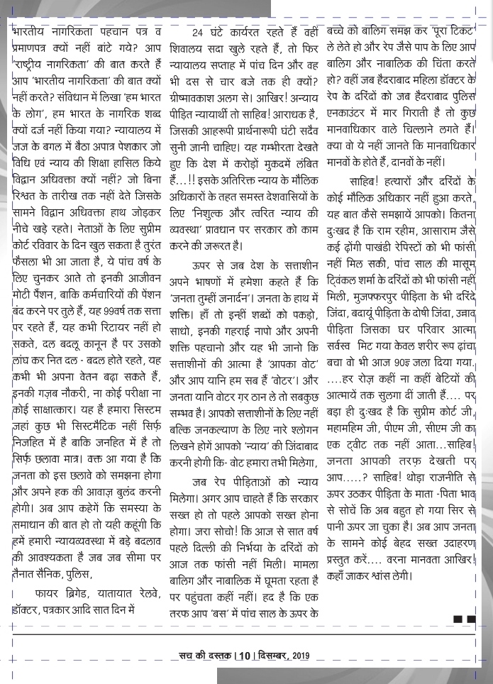 जब रेप पीड़िताओं को न्याय मिलेगा। अगर आप चाहते हैं कि सरकार सख्त हो तो पहले आपको सख्त होना होगा। जरा सोचो! कि आज से सात वर्ष पहले दिल्ली की निर्भया के दरिंदों को आज तक फांसी नहीं मिली। मामला बालिग और नाबालिक में घूमता रहता है पर पहुंचता कहीं नहीं। हद है कि एक तरफ आप ‘बस’ में पांच साल के ऊपर के बच्चे को बालिग समझ कर ‘पूरा टिकट’ ले लेते हो और रेप जैसे पाप के लिए आप बालिग और नाबालिक की चिंता करते हो? वहीं जब हैदराबाद महिला डॉक्टर के रेप के दरिंदों को जब हैदराबाद पुलिस एनकाउंटर में मार गिराती है तो कुछ मानवाधिकार वाले चिल्लाने लगते हैं। क्या वो ये नहीं जानते कि मानवाधिकार मानवों के होते हैं, दानवों के नहीं।