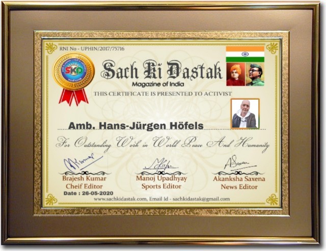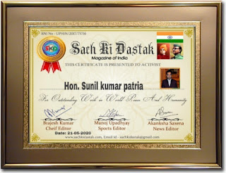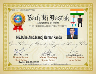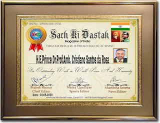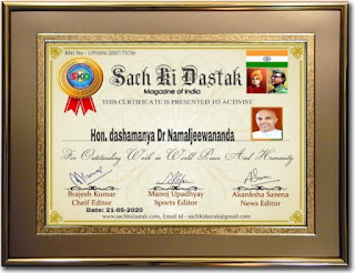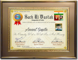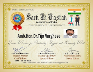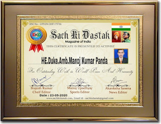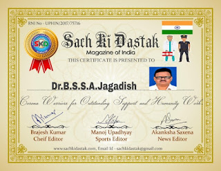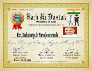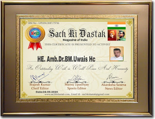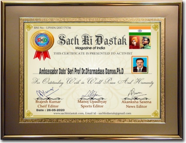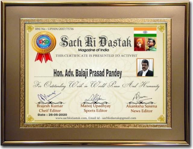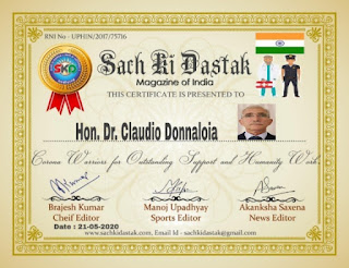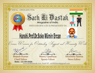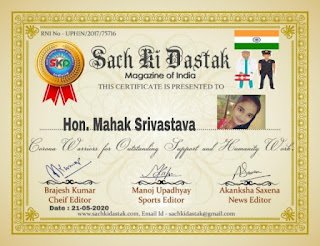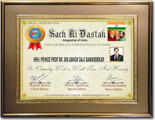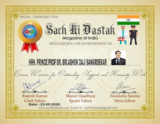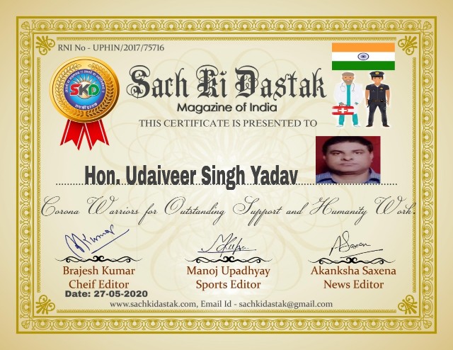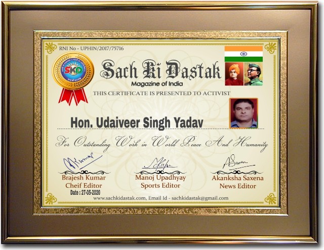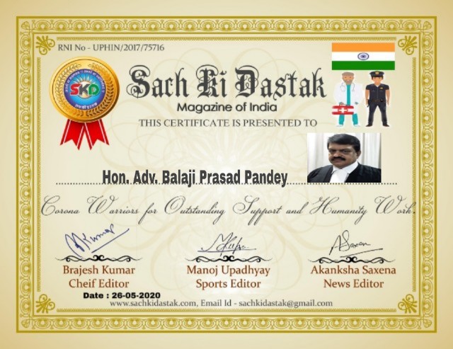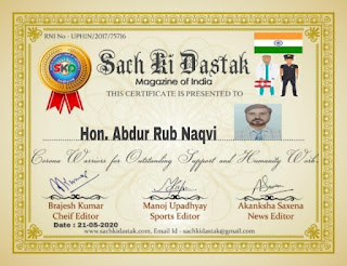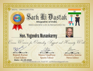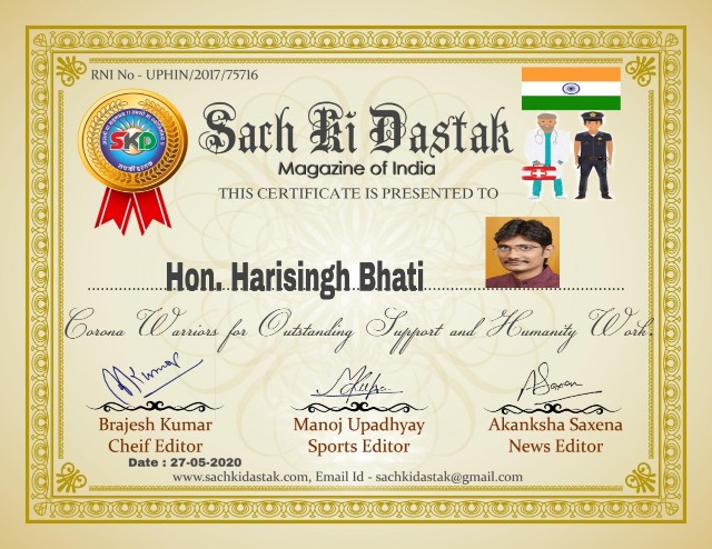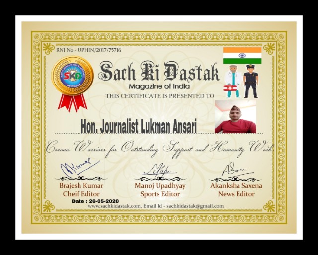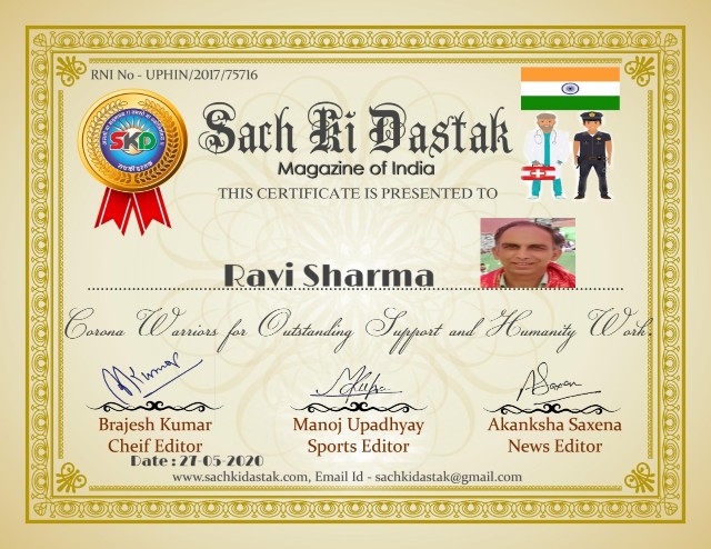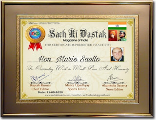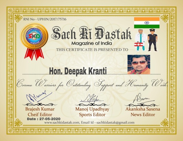 इस भयावह कोरोना काल में जो भी जरूरतमंदों की मदद कर रहे हैं और जो विश्व शांति का संदेश दे रहे हैं ऐसे सभी महानुभावों को सच की दस्तक राष्ट्रीय मासिक पत्रिका वाराणसी उत्तर की ओर से निशुल्क रूप से वर्ल्ड पीस एंड ह्यूमैनिटी एक्टिविस्ट कोरोना योद्धा सम्मान द्वारा सम्मानित किया जा रहा है।