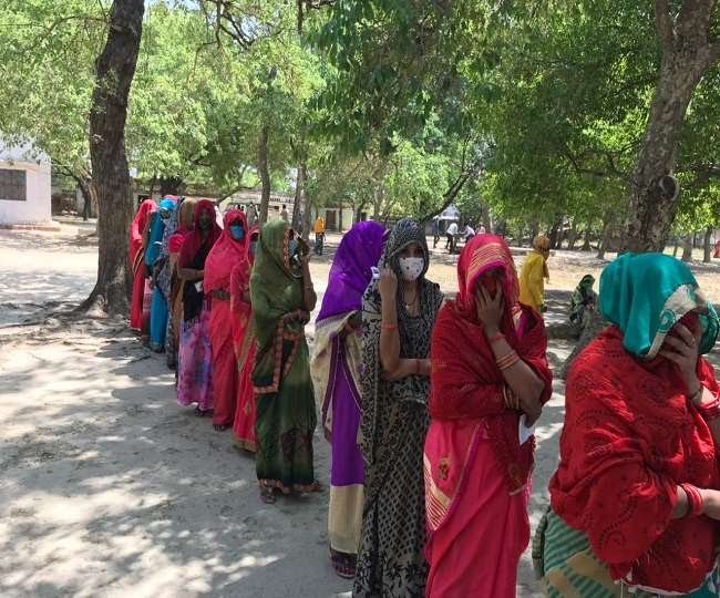 अमेठी मे मास्क लगाकर और सोशल डिस्टेंसिंग का पालन कर रहे मतदाता